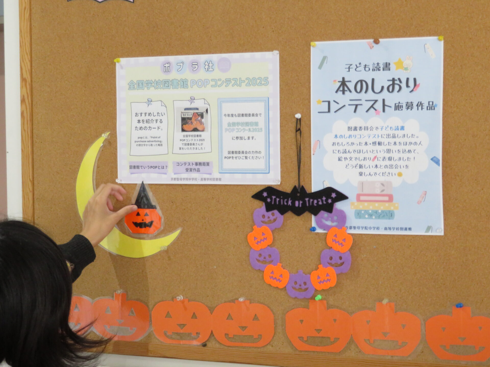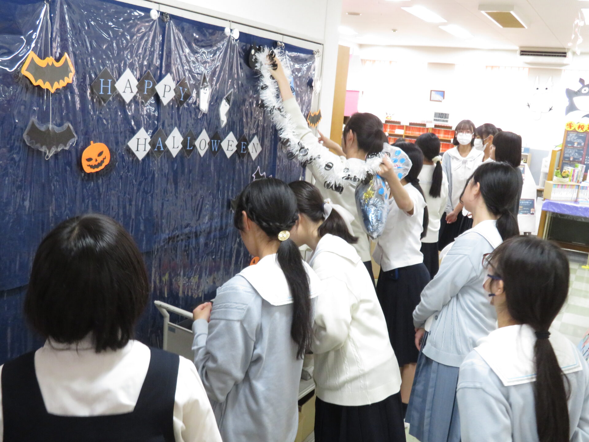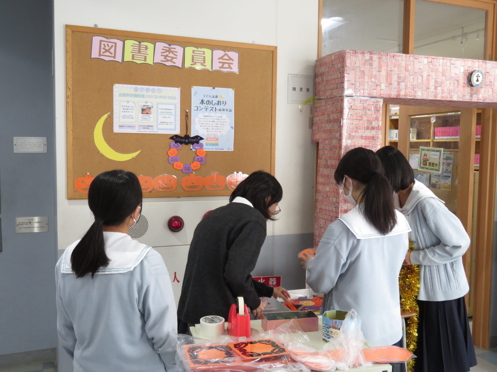 図書委員さんが図書館をハロウィン仕様に装飾するとのことで、お昼休みに行ってきました。