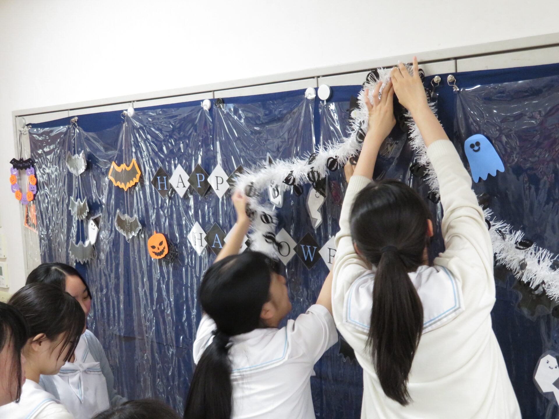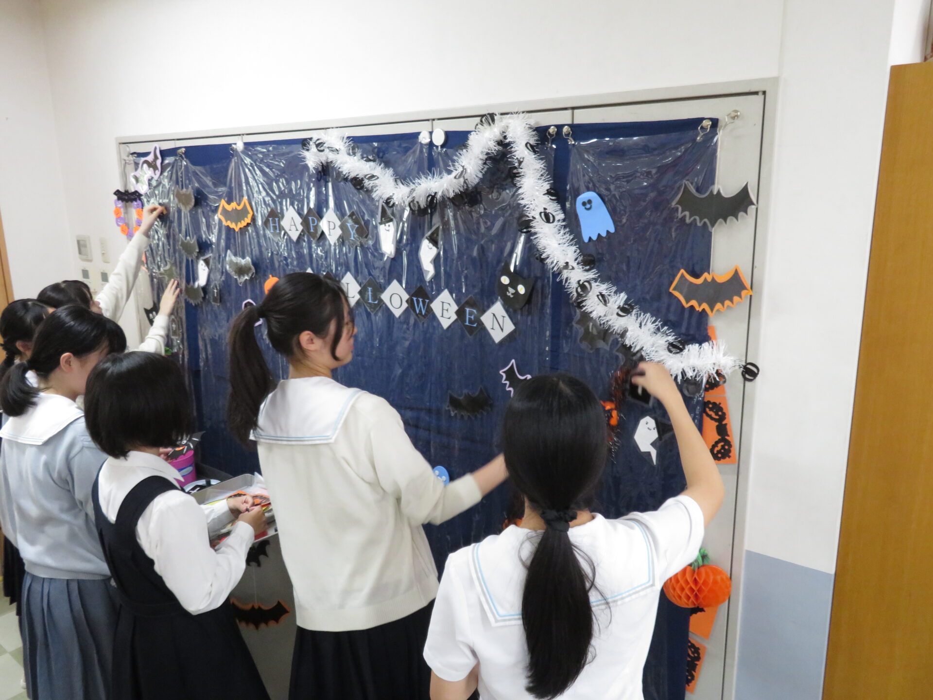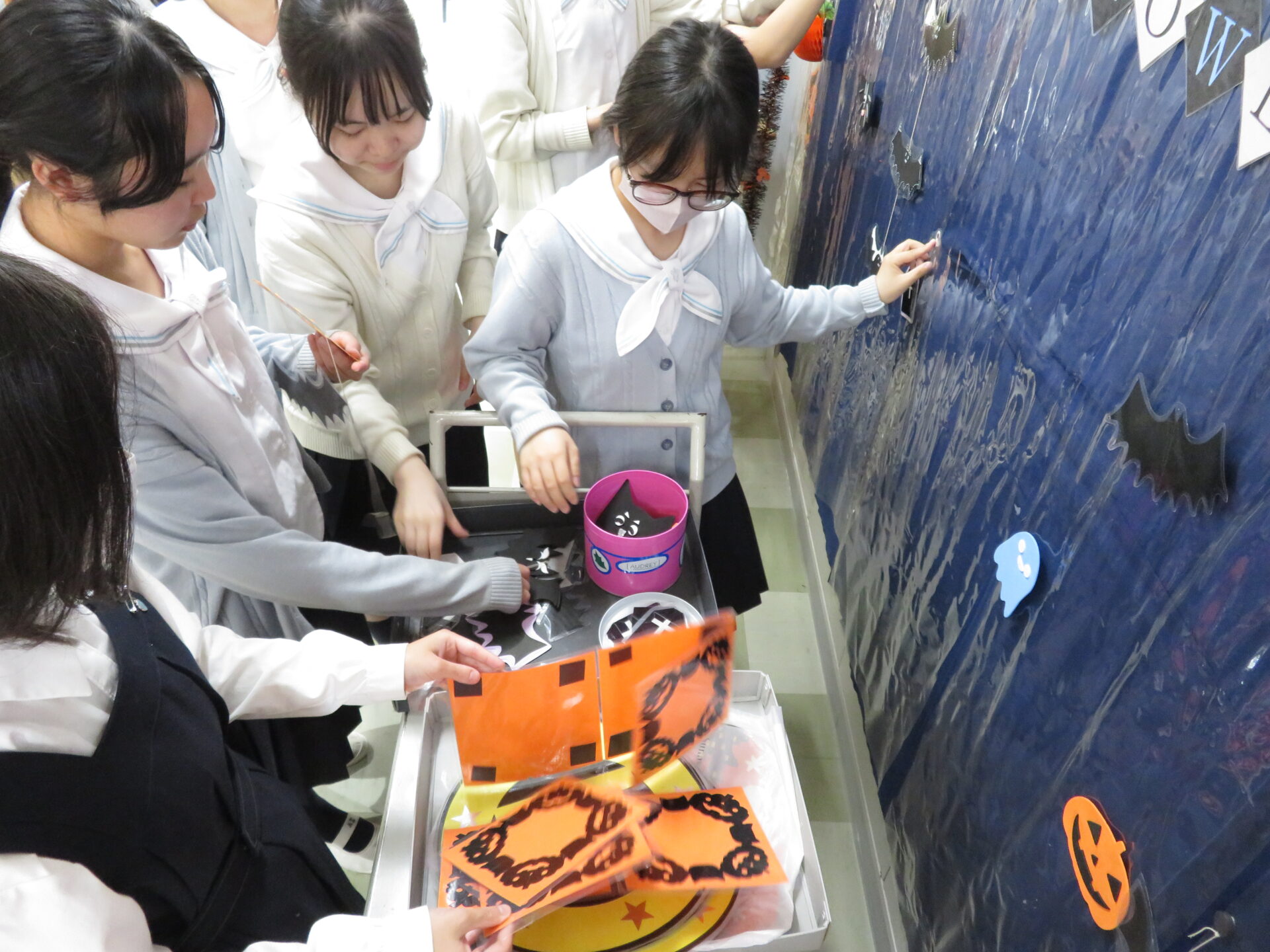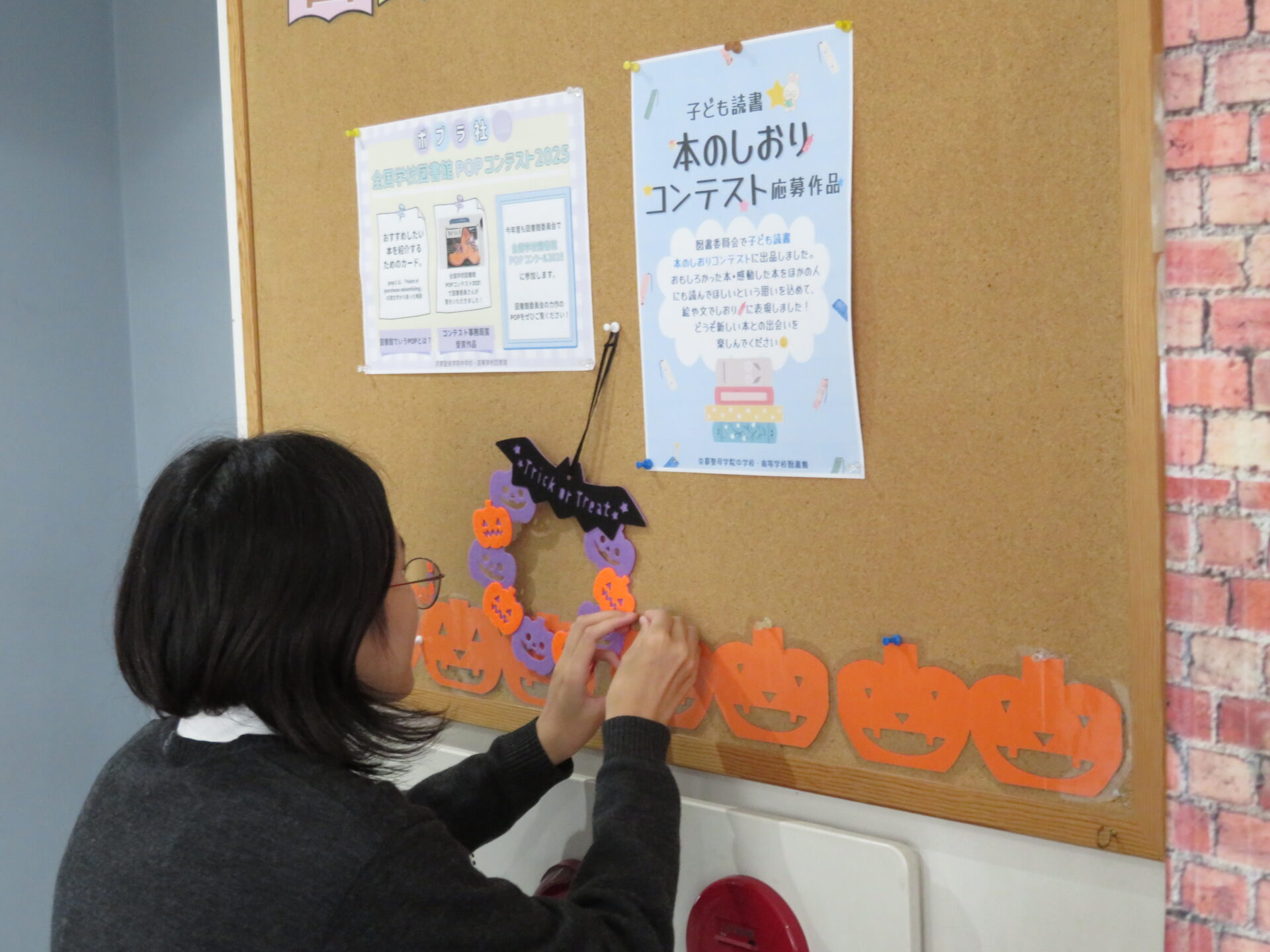 図書委員さんが図書館をハロウィン仕様に装飾するとのことで、お昼休みに行ってきました。