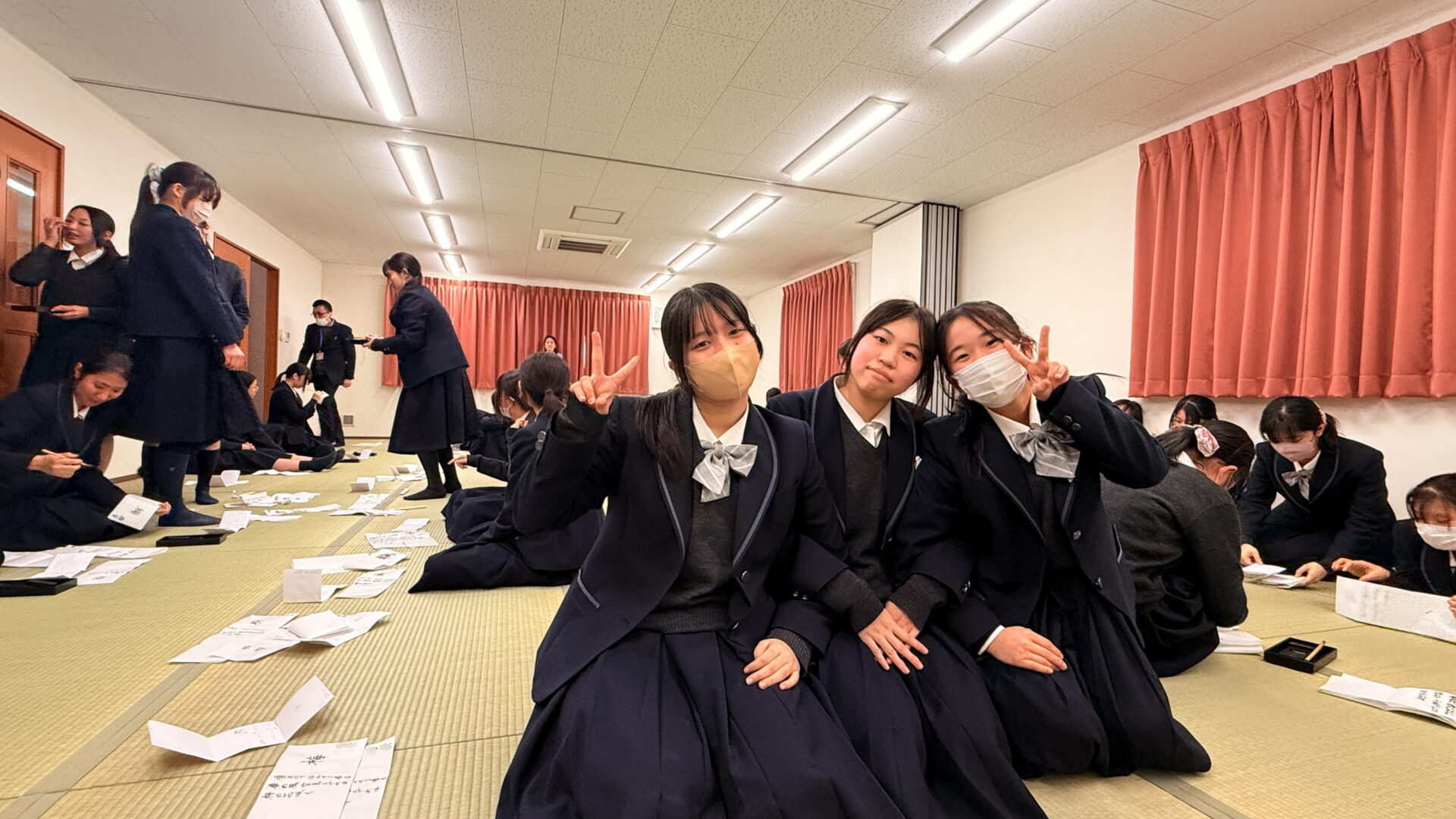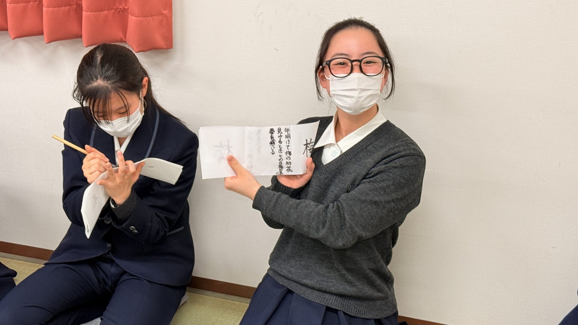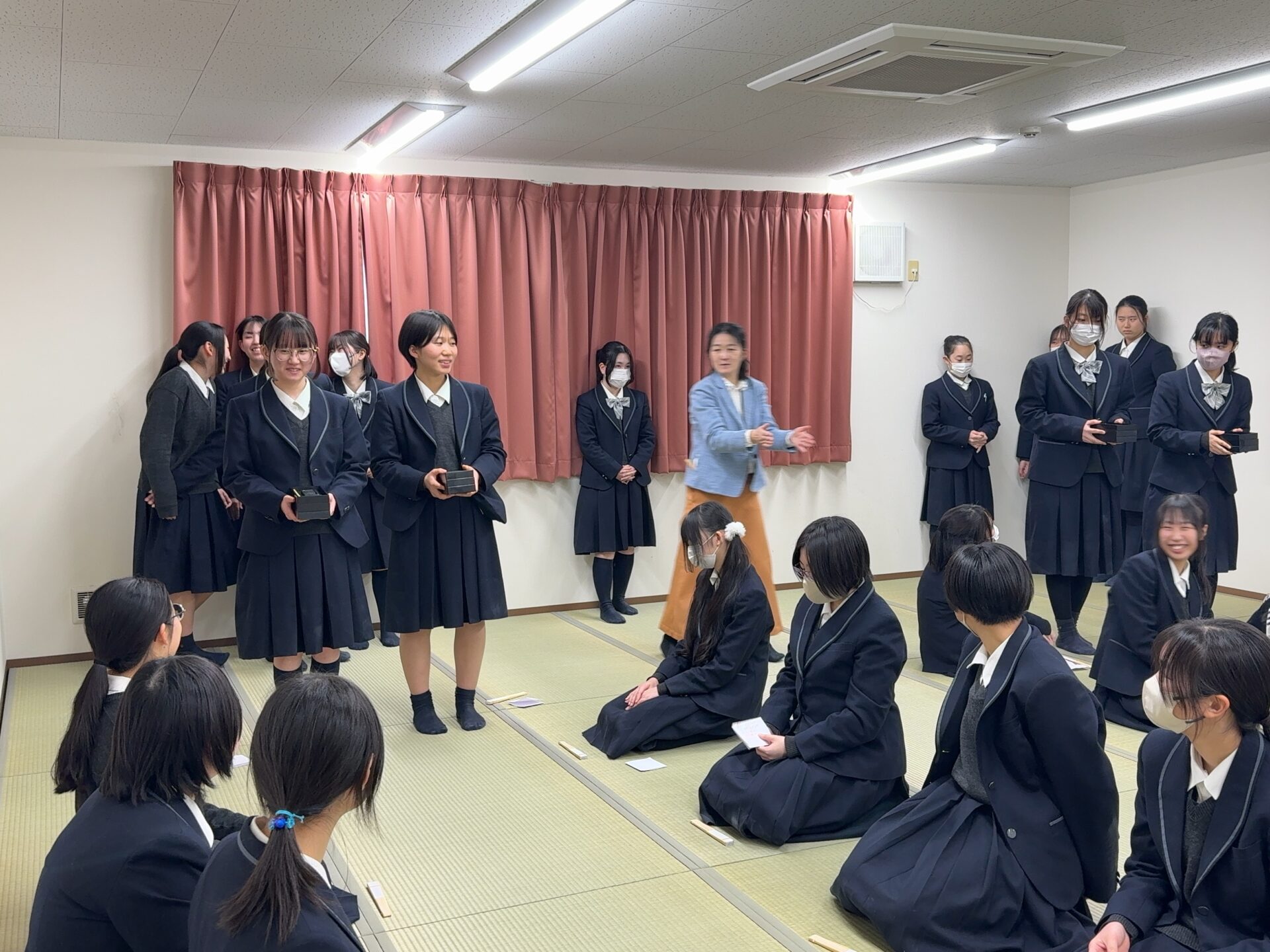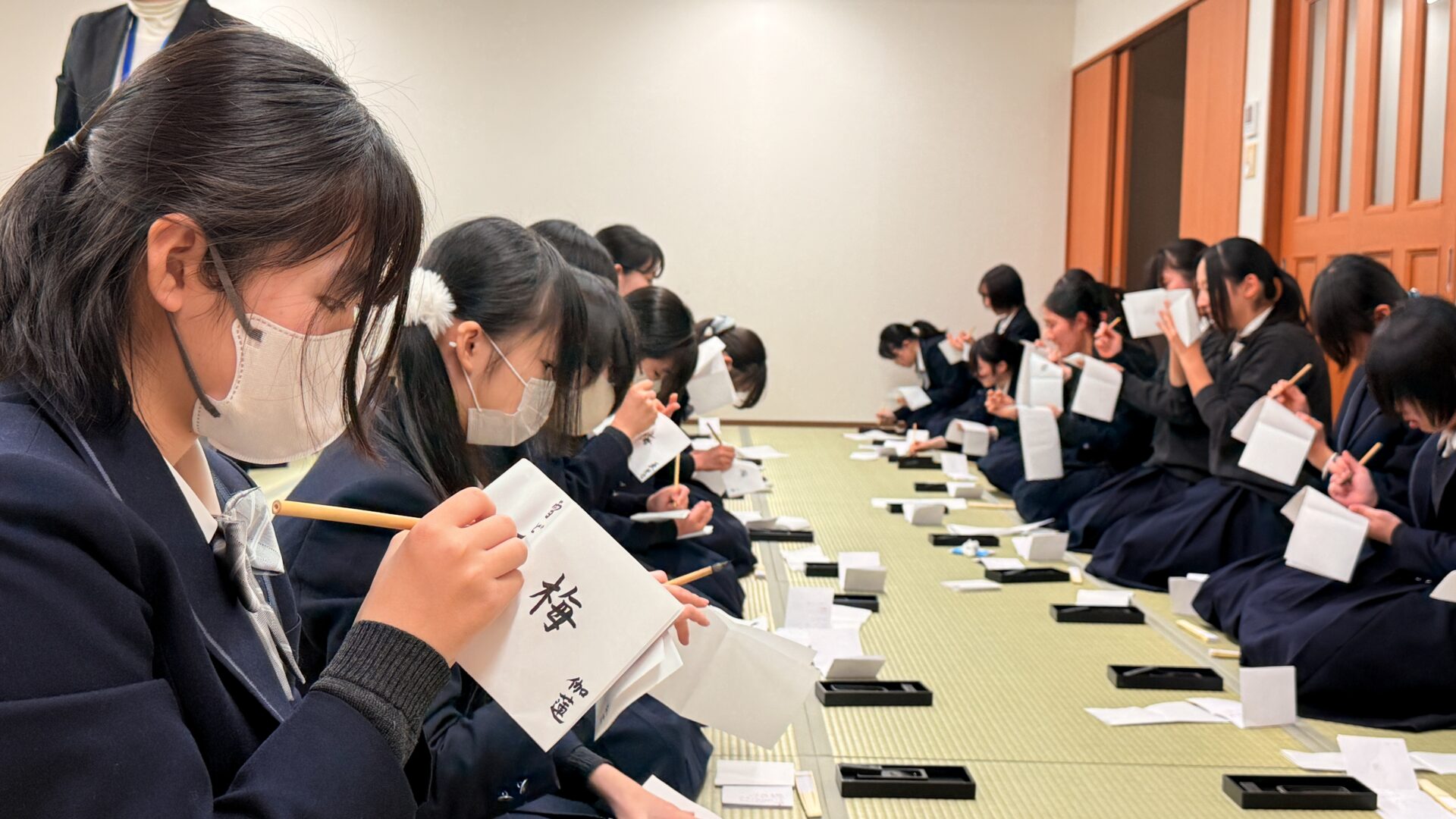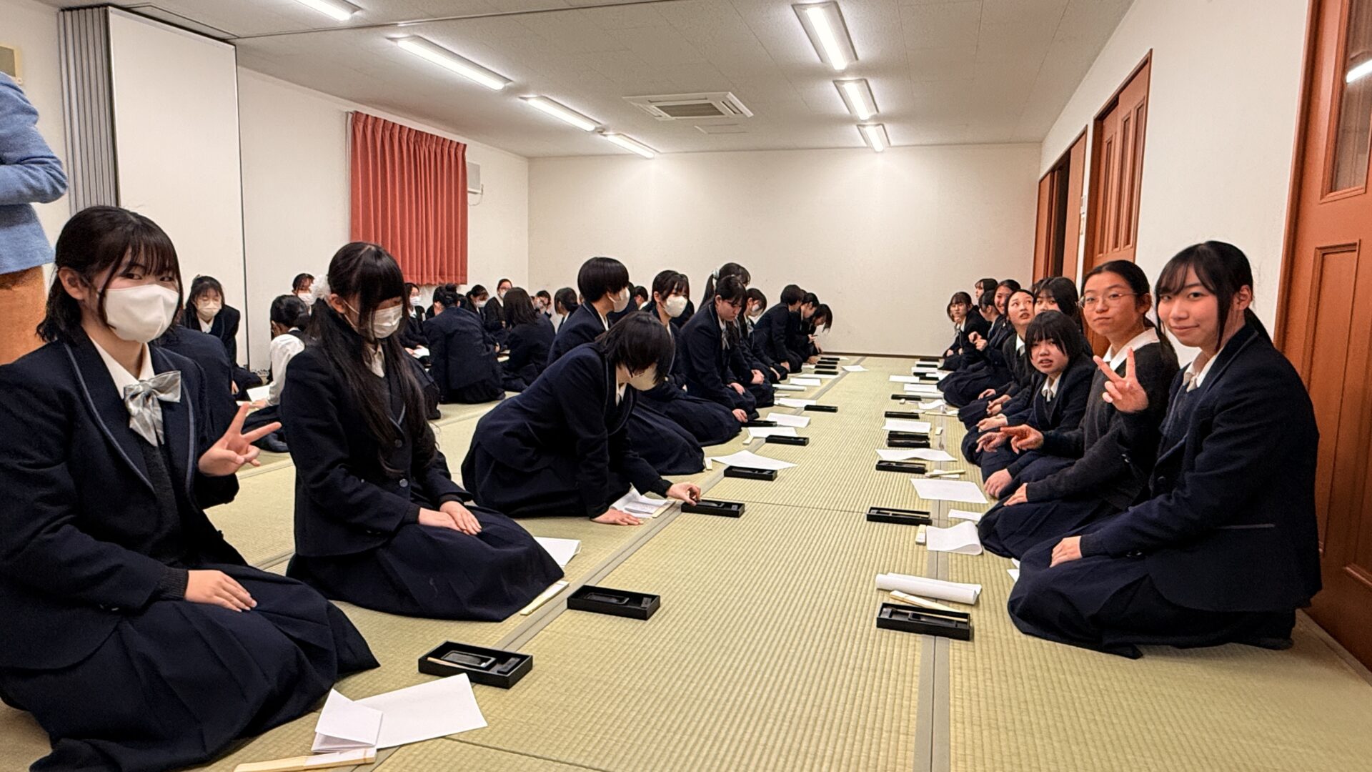 2025.02.04高等学校Ⅲ類Ⅱ類高校_Ⅱ・Ⅲ類が和歌講座 講演会 高校2年生の授業で、講師の方をお招きして冷泉家和歌講座を実施しました。2時間連続の授業、1時間目は和歌を詠んでいたようで、2時間目に見学してきました。在校生のオリジナルの和歌のようです。和やかに講座は進みましたが、筆を使って和紙に書く時には、真剣な表情になる生徒さんがとても印象的でした。
