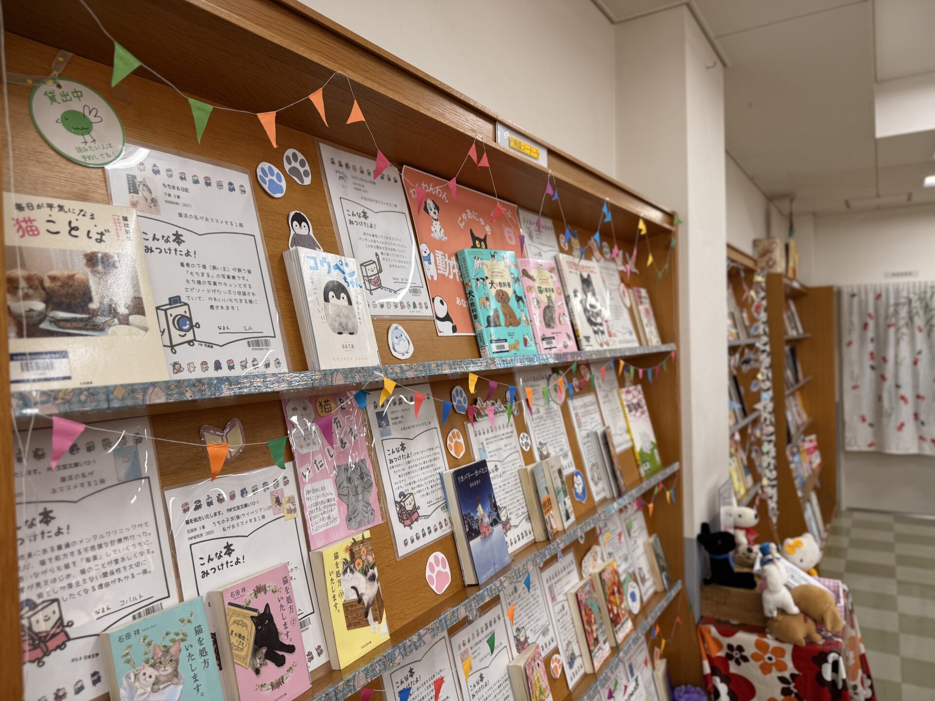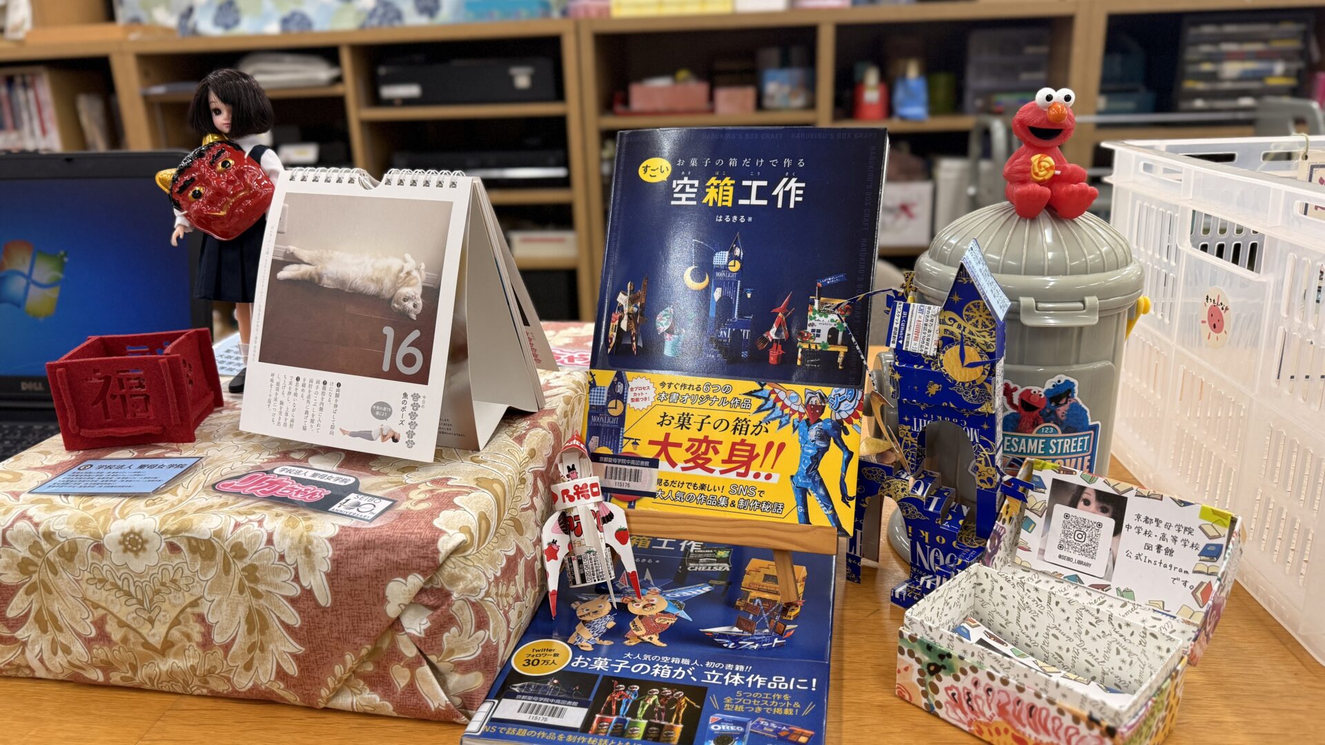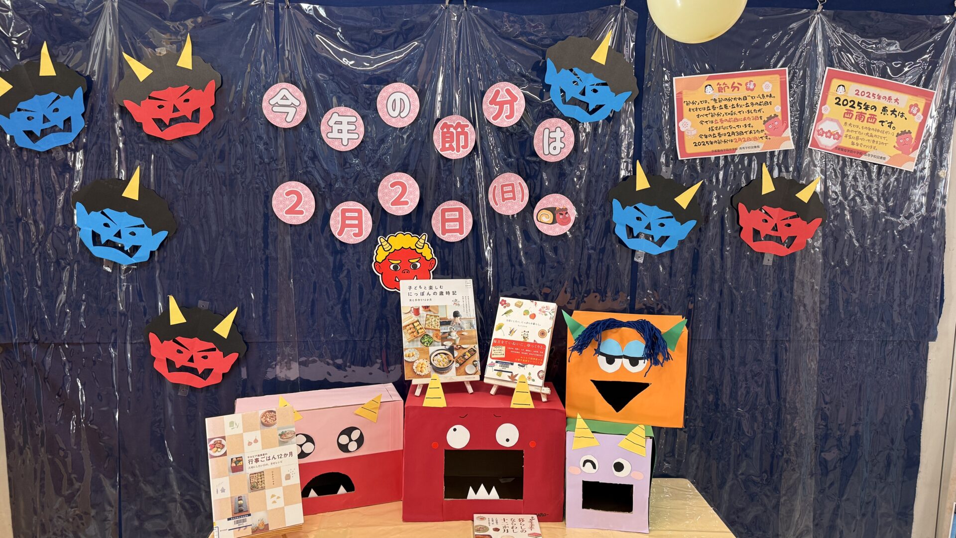 図書館の装飾が節分仕様になっていました。図書委員さんもお手伝いされていました。