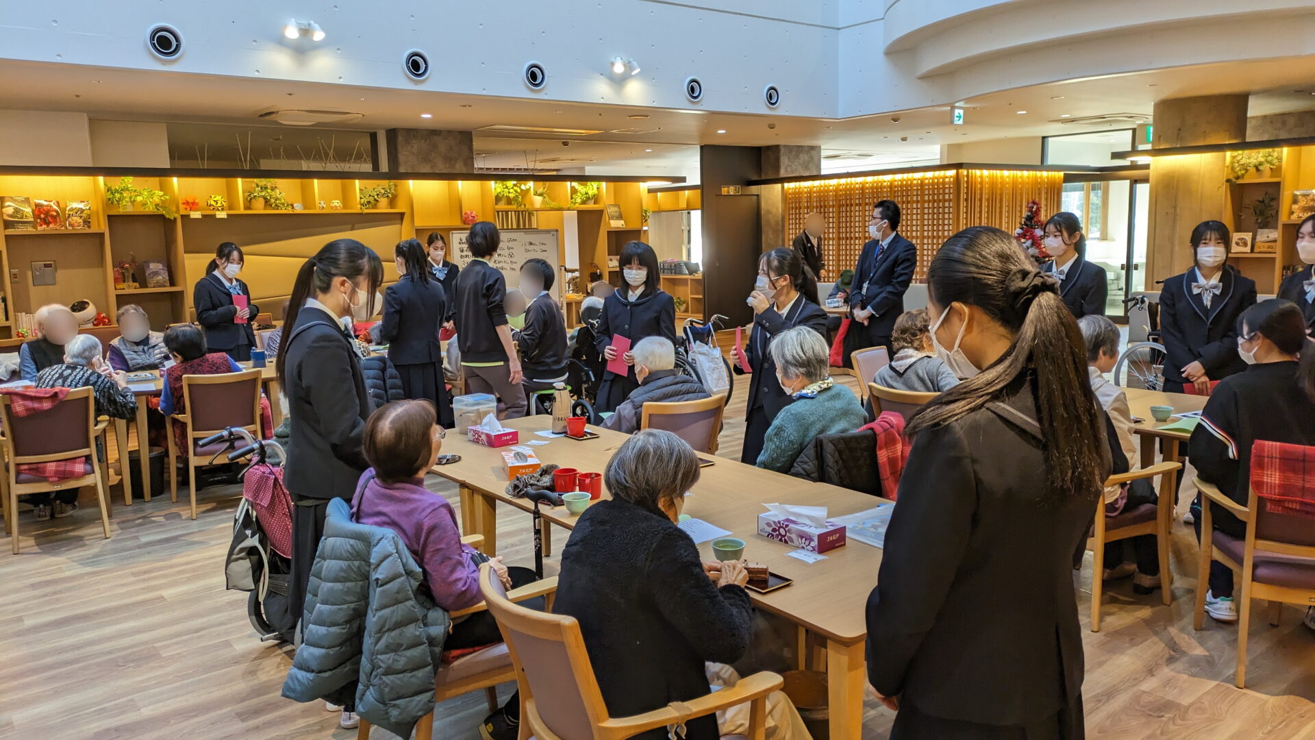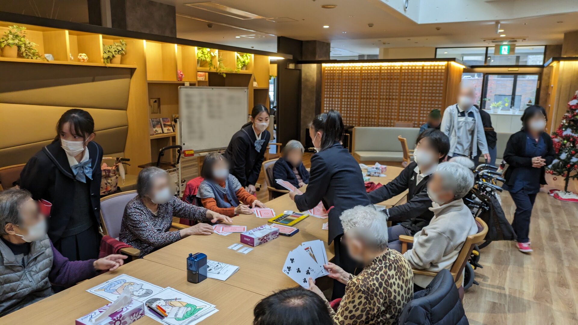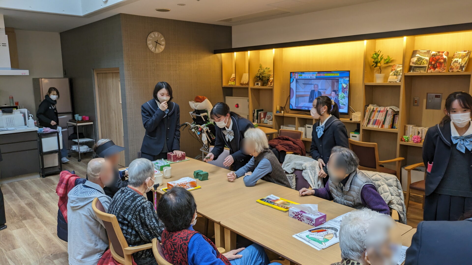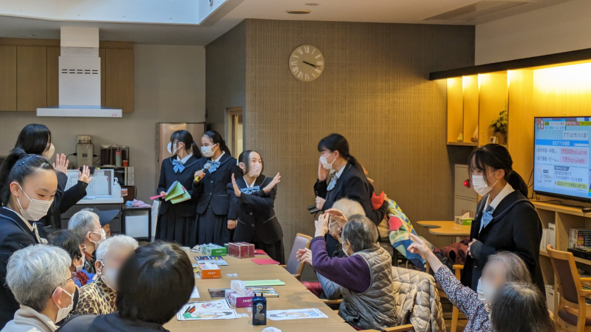 2024.12.27中学校高等学校中高_高齢者施設訪問 例年訪問させていただいている高齢者施設に、今年もお伺いさせていただきました。コロナ禍ではできなかったふれあいをさせていただきました。ありがとうございました。施設内はインフルエンザ等の感染予防のためマスク着用でしたが、ミニゲームやお話をさせていただきました。マスク越しでも生き生きとした表情が伝わりますね!