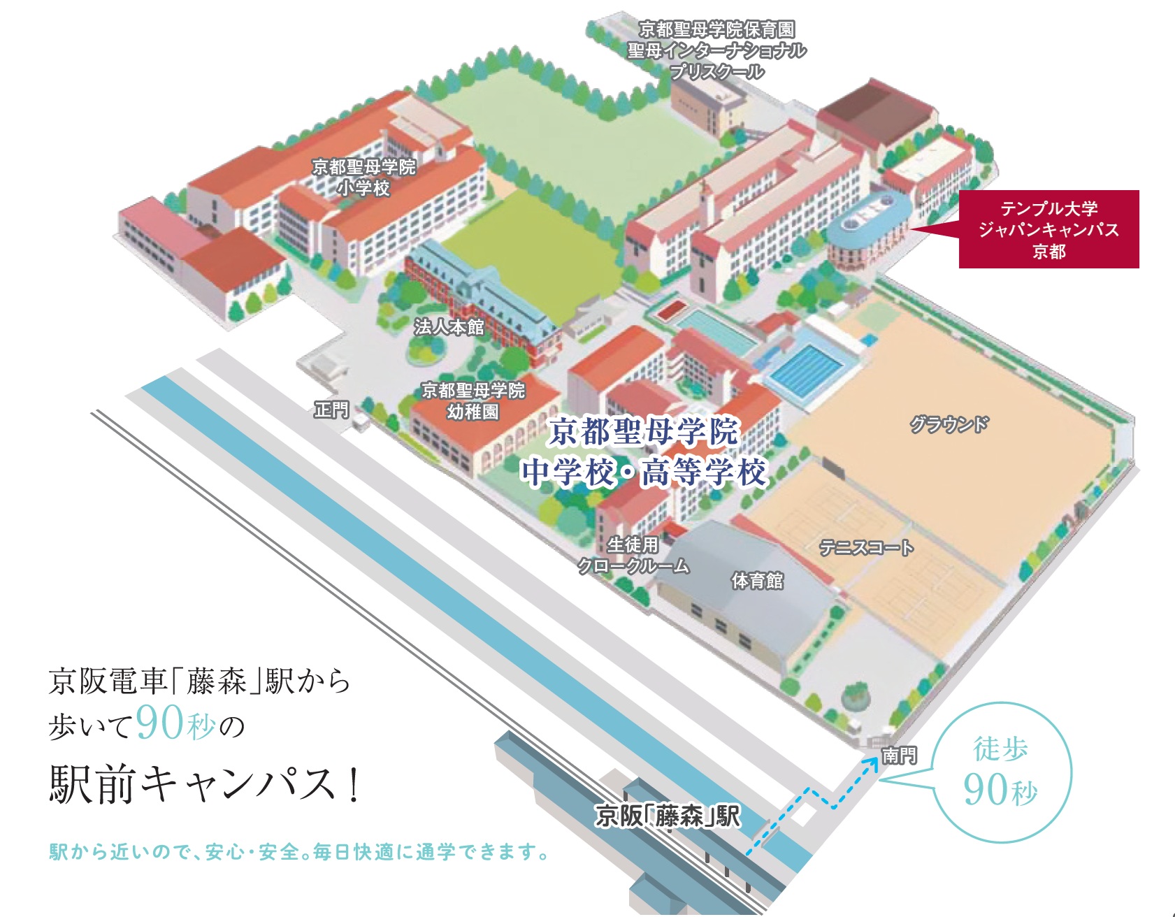 本学院は、1948年に京都深草旧16師団司令部の土地2万坪及び建物の払い下げを受けました。その場所に、今では、京都聖母学院保育園、聖母インターナショナルプリスクール、京都聖母学院幼稚園、京都聖母学院小学校、京都聖母学院中学校・高等学校、そして2025年1月にはテンプル大学ジャパンキャンパス京都が開設されました。