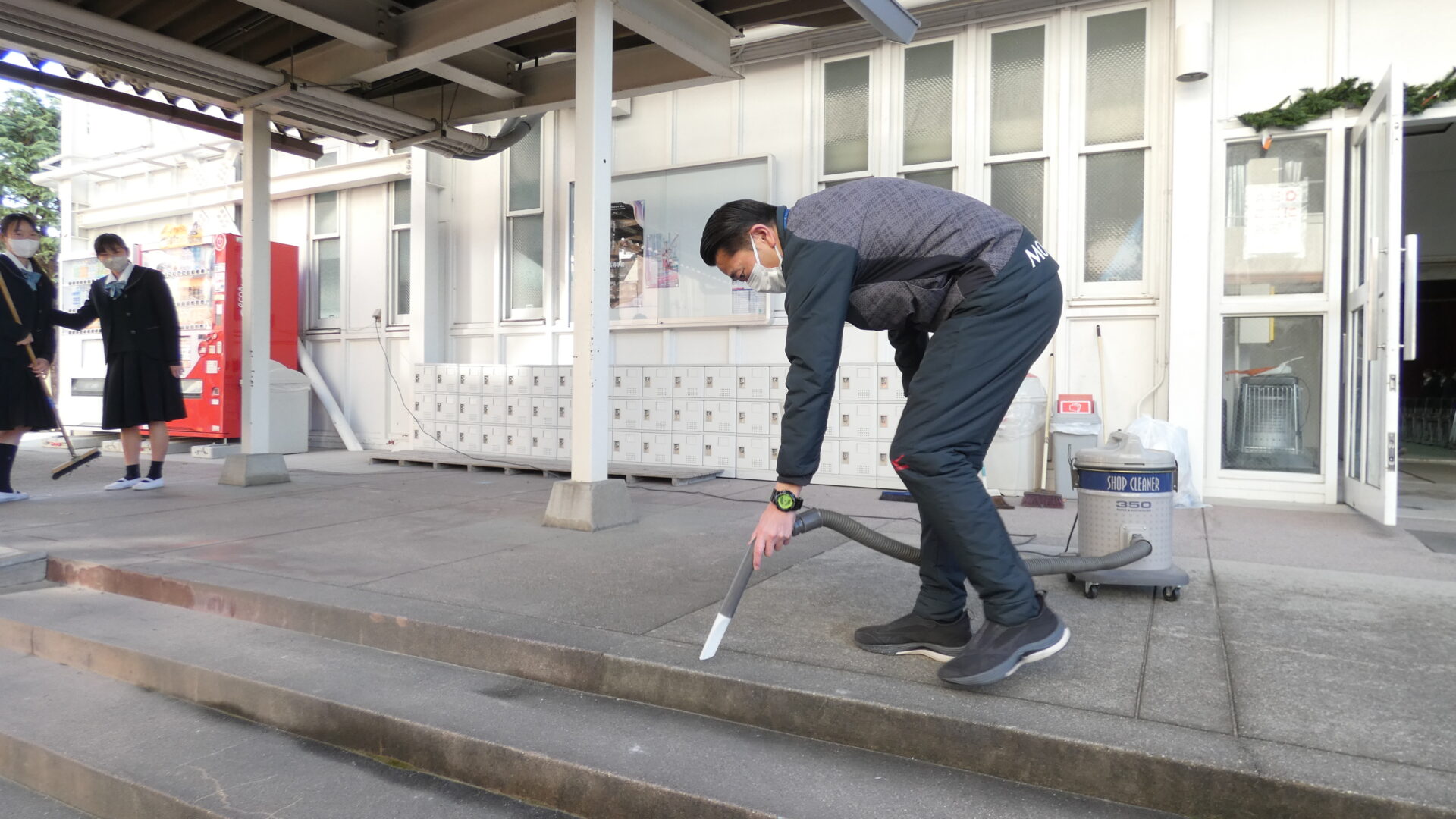 体育館出入口もみんなでお掃除。体育教員も気合が入っておりました。