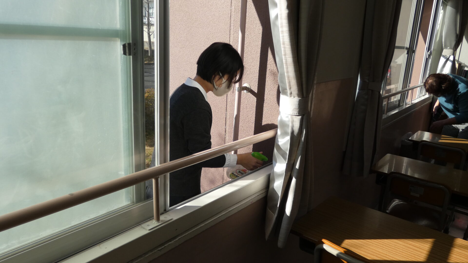 1階の教室では、外から窓枠を綺麗にしてくれています。