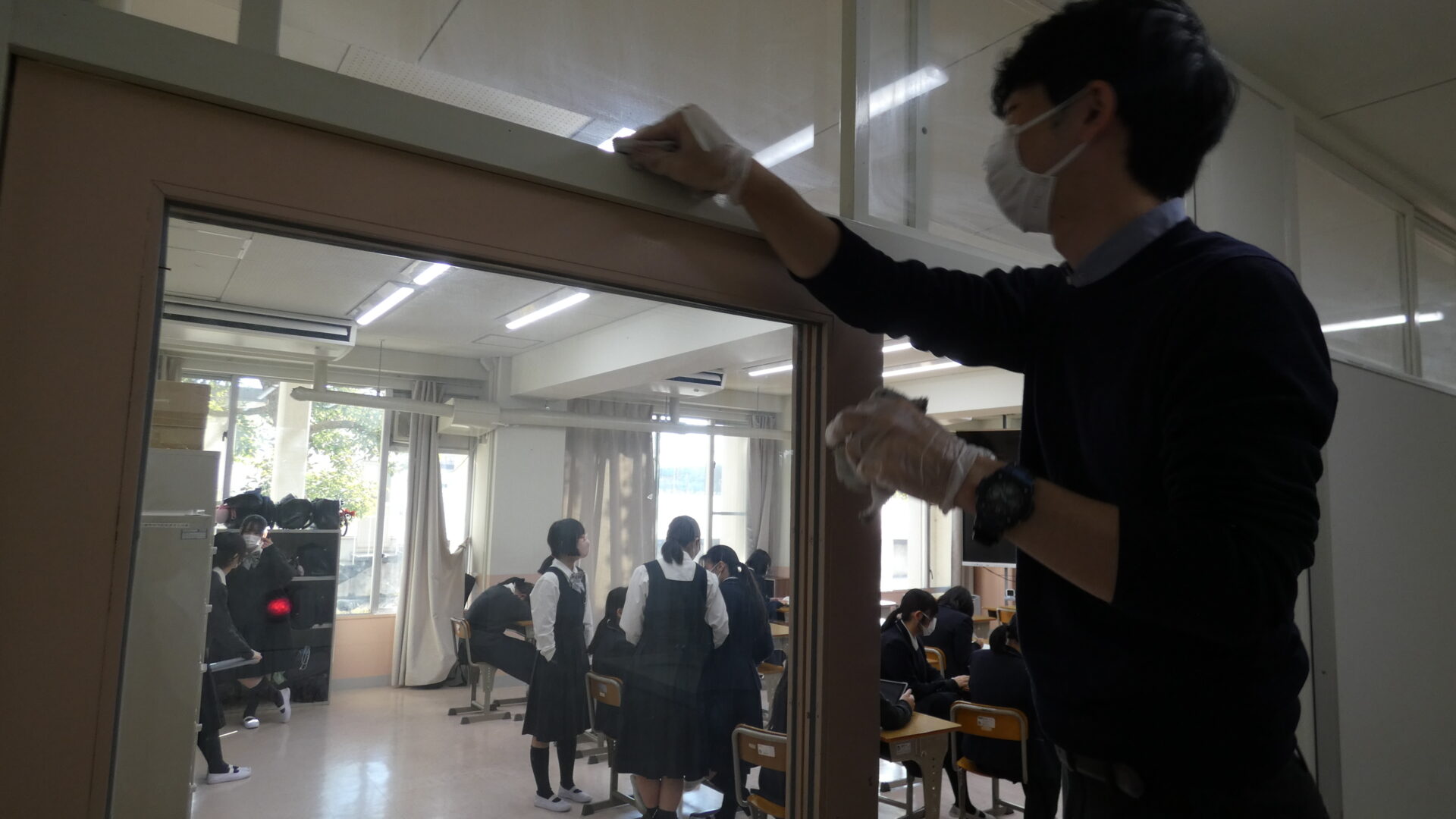 掃除後の整理整頓も忘れておりません。担任は、掃除後も生徒が手の届かない所が気になるようで、掃除中!