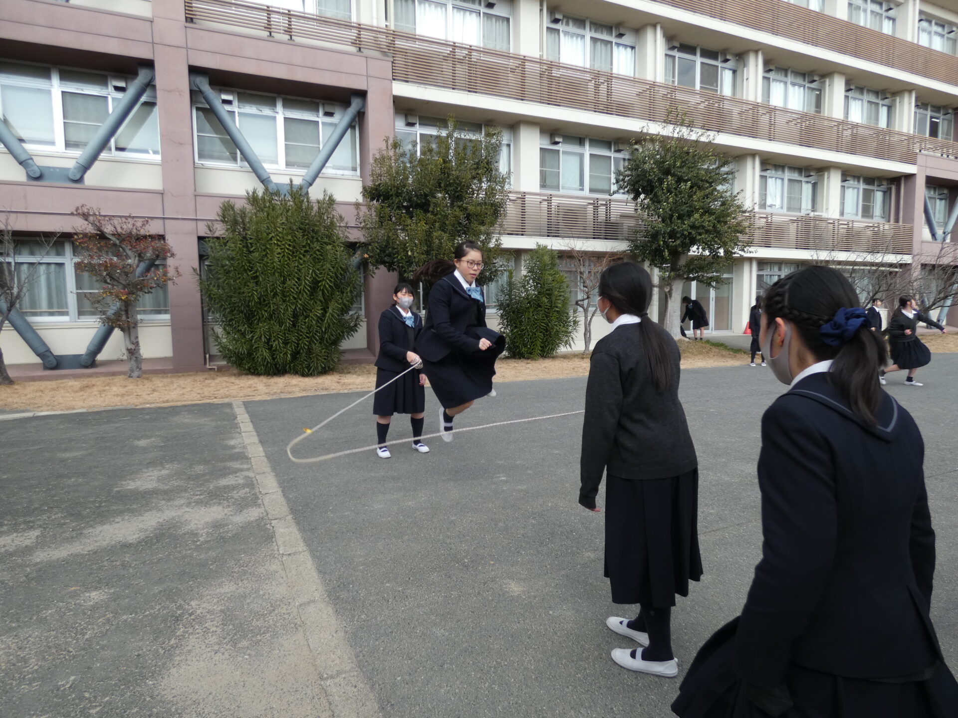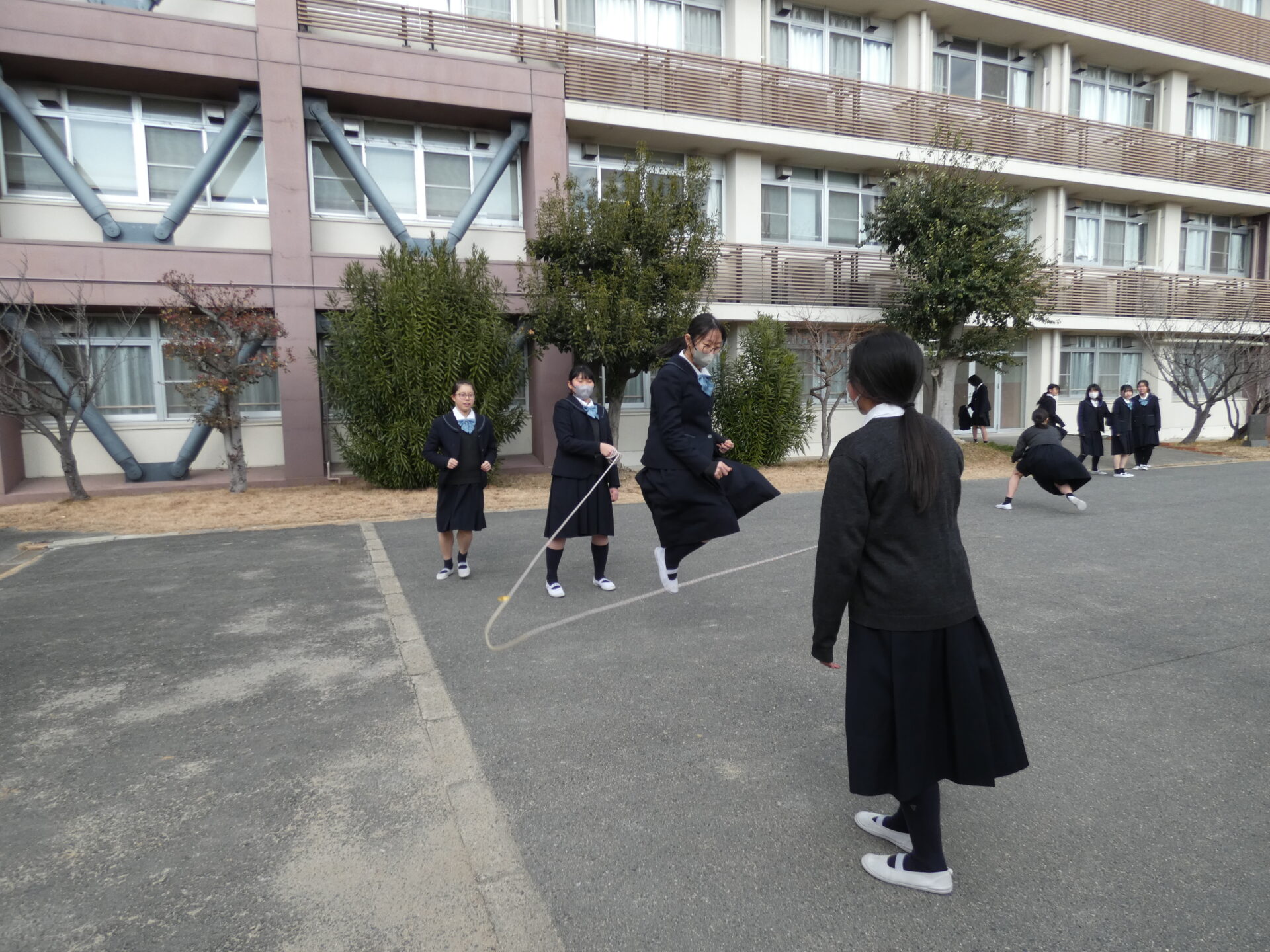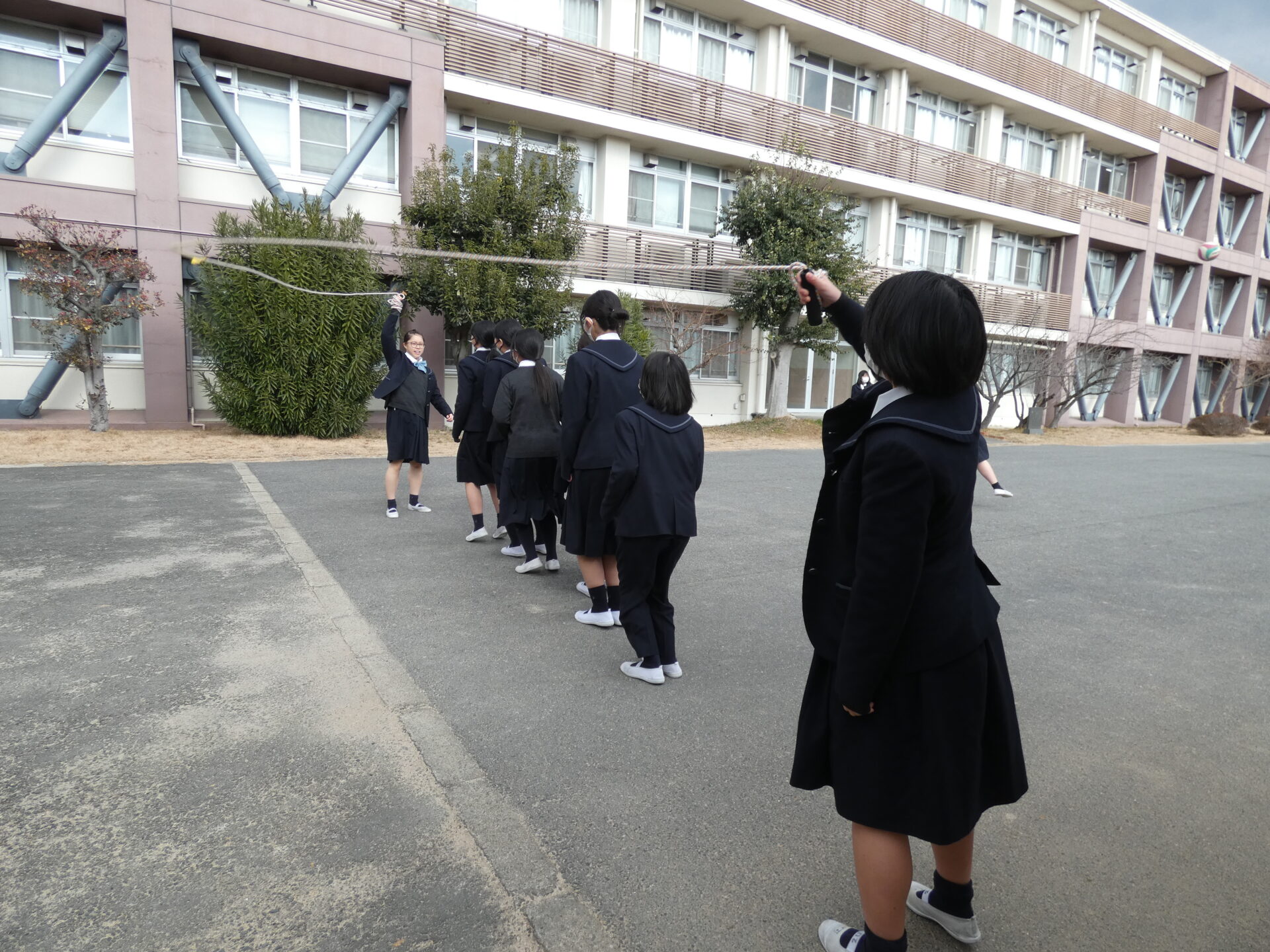 連日寒い日が続きますが、お昼休みに校舎の外から笑い声が聞こえてきました。今週の水曜日に中学2年生がスポーツ大会を実施するようで、その練習をしていました。色んなクラスの生徒たちが一緒に練習をしていましたので撮影させてもらいました。実施する種目を聞くと、ドッヂボールと大繩のようです。