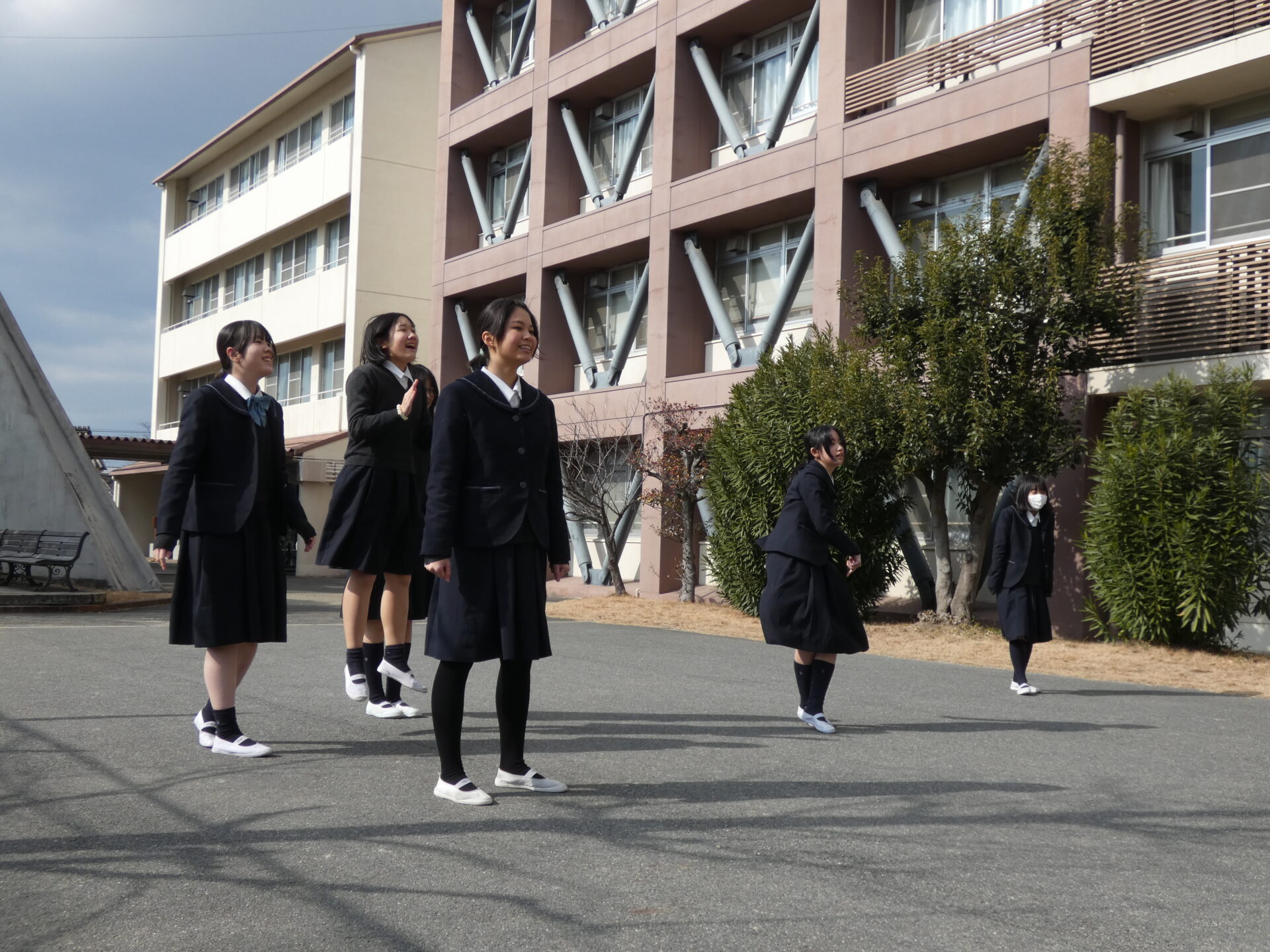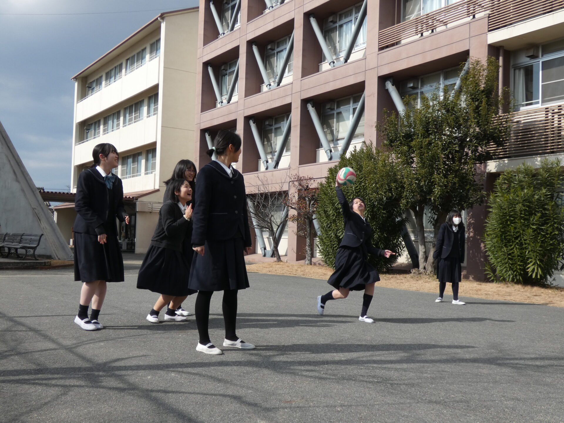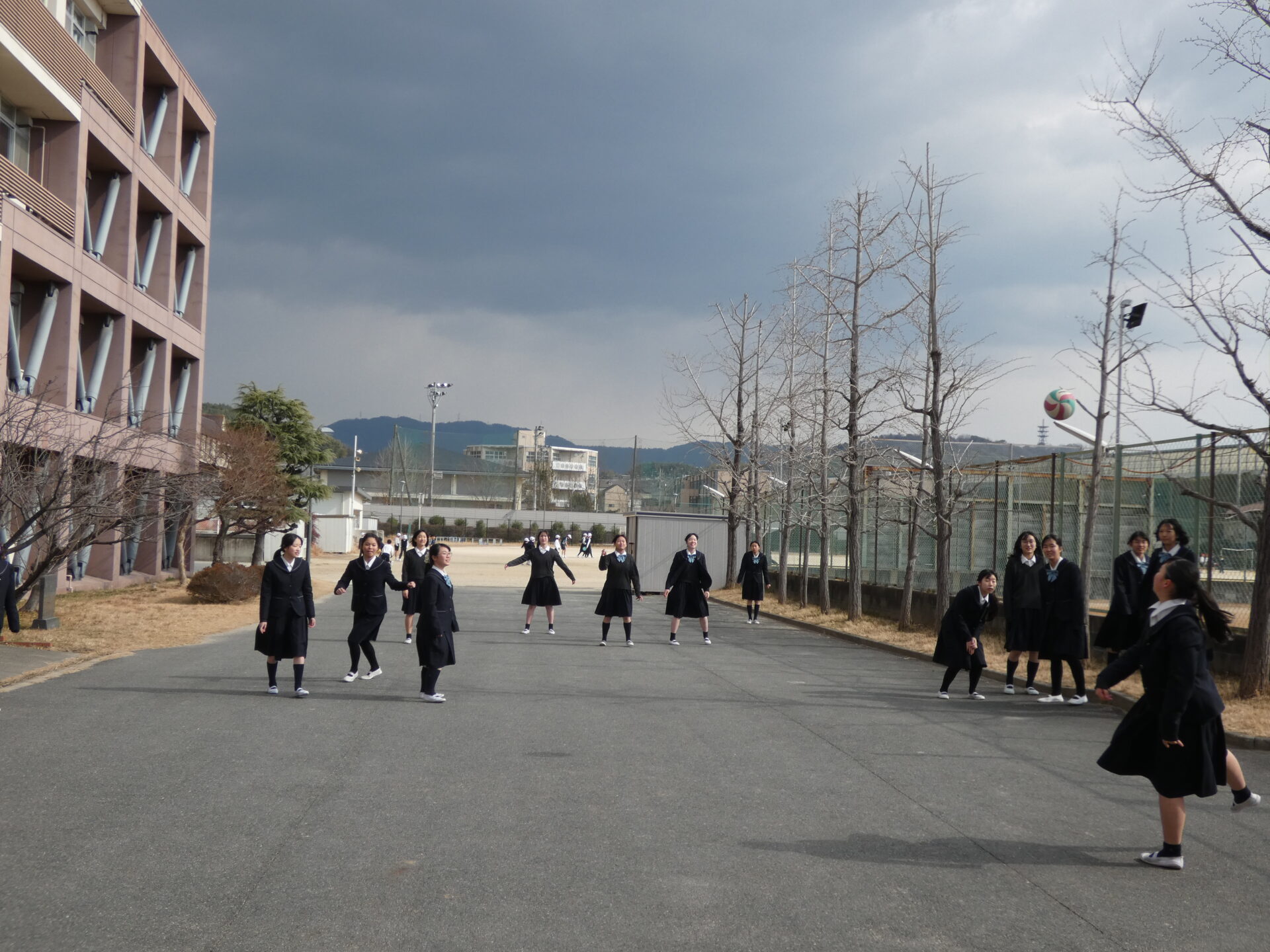 連日寒い日が続きますが、お昼休みに校舎の外から笑い声が聞こえてきました。今週の水曜日に中学2年生がスポーツ大会を実施するようで、その練習をしていました。色んなクラスの生徒たちが一緒に練習をしていましたので撮影させてもらいました。実施する種目を聞くと、ドッヂボールと大繩のようです。