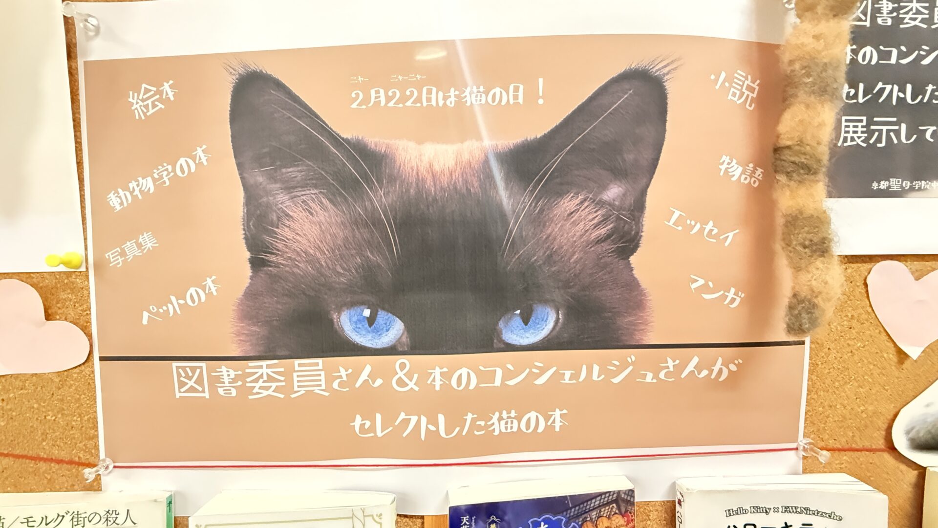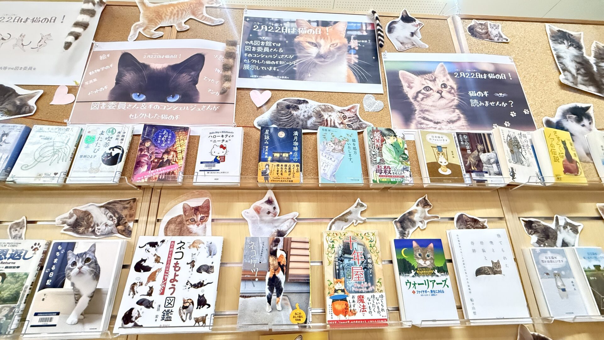 2月22日は「ニャーニャーニャー」で猫の日ということで、図書委員さんと、本好きな生徒たち(本校では「本のコンシェルジュさん」と呼んでいます)が、猫にちなんだ本を選んで展示してくれました。