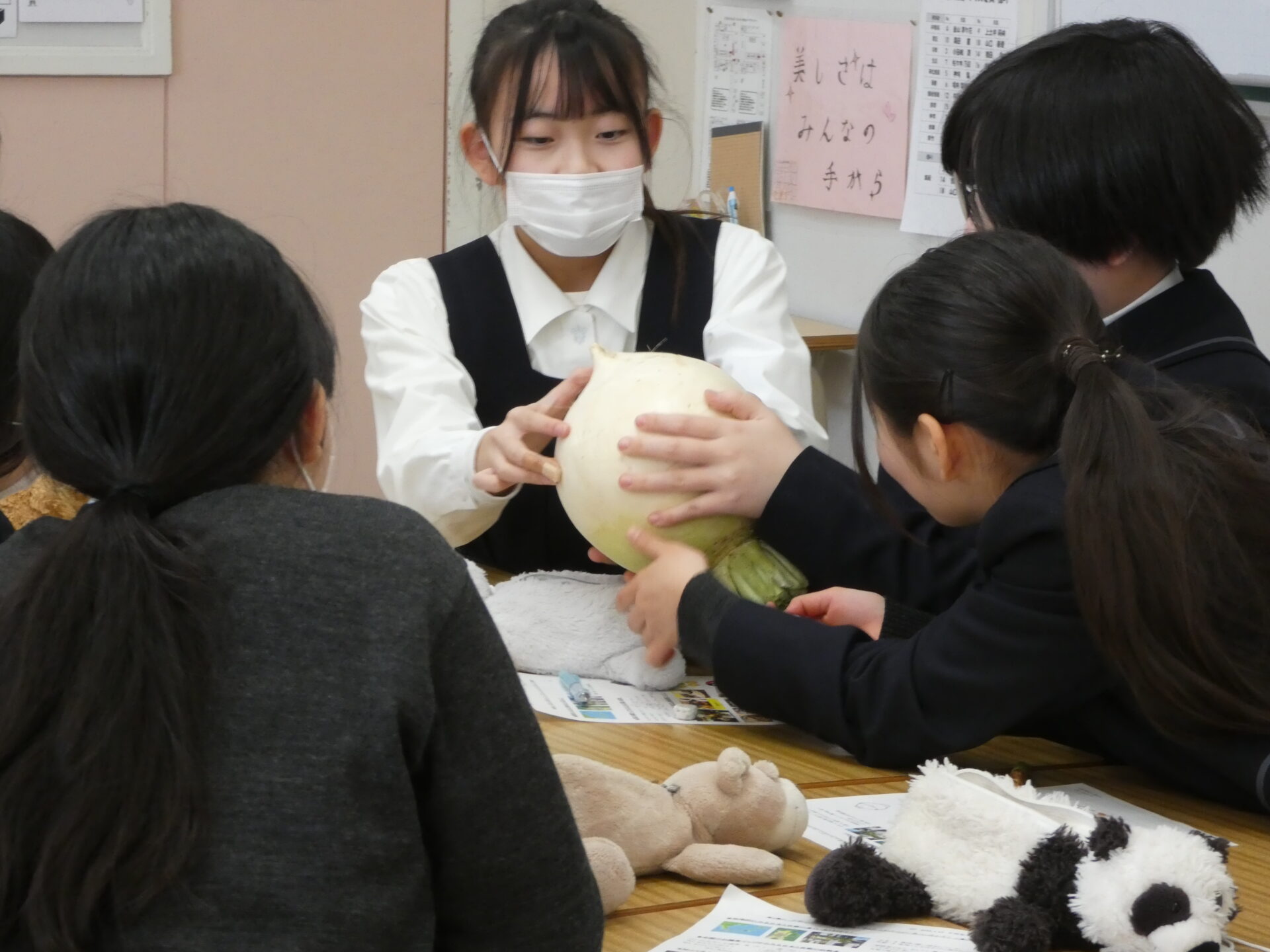 聖護院大根、えび芋、金時人参を手に取りながら、それぞれの特徴について学びました。さらに、金時人参と西洋人参(一般的なにんじん)の食べ比べも実施。味や香り、食感の違いを確かめながら、食材への理解を深めました。