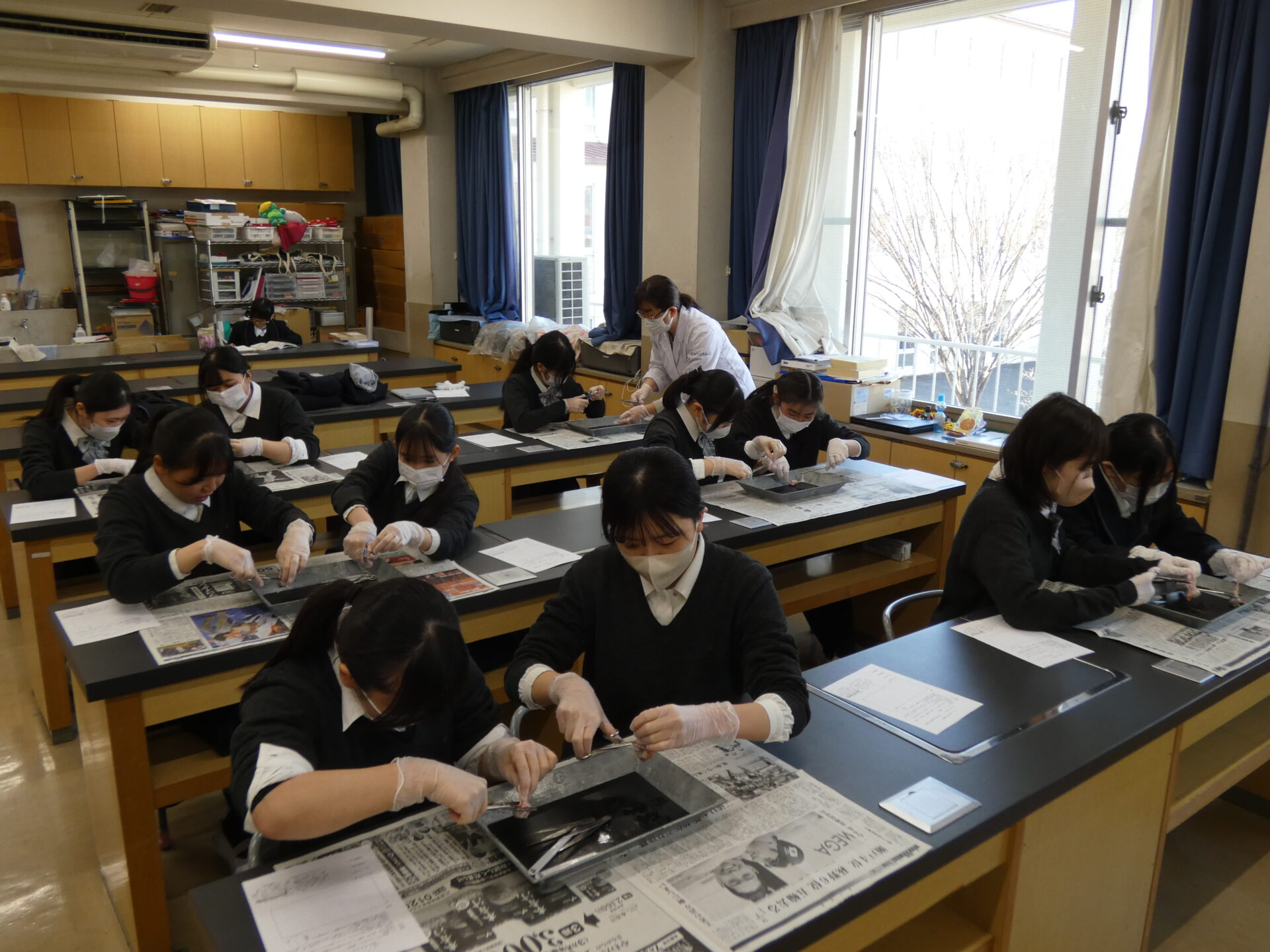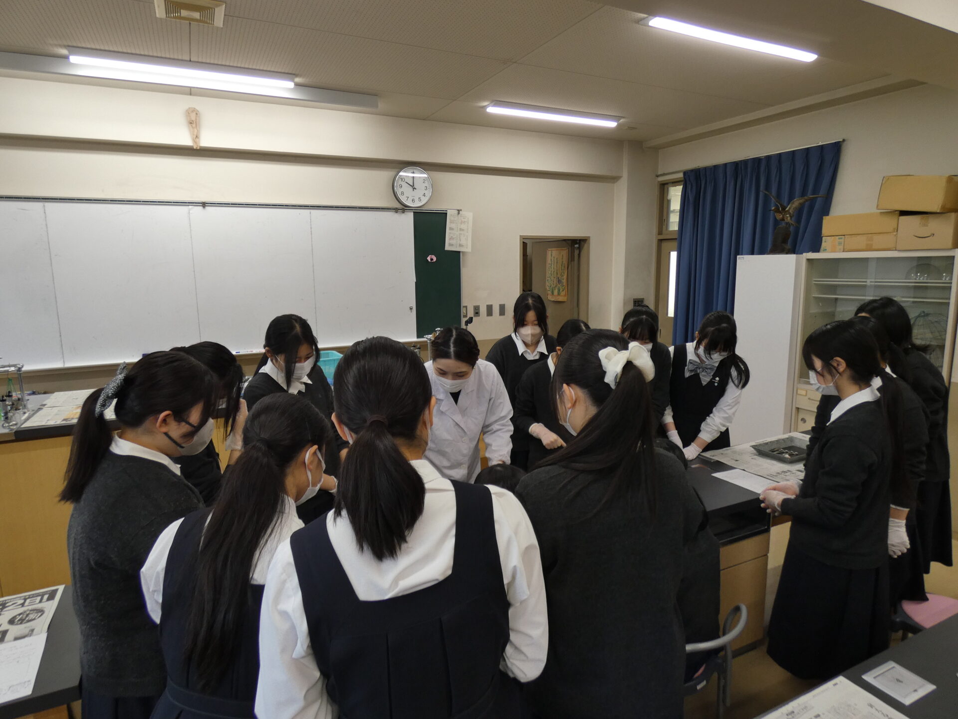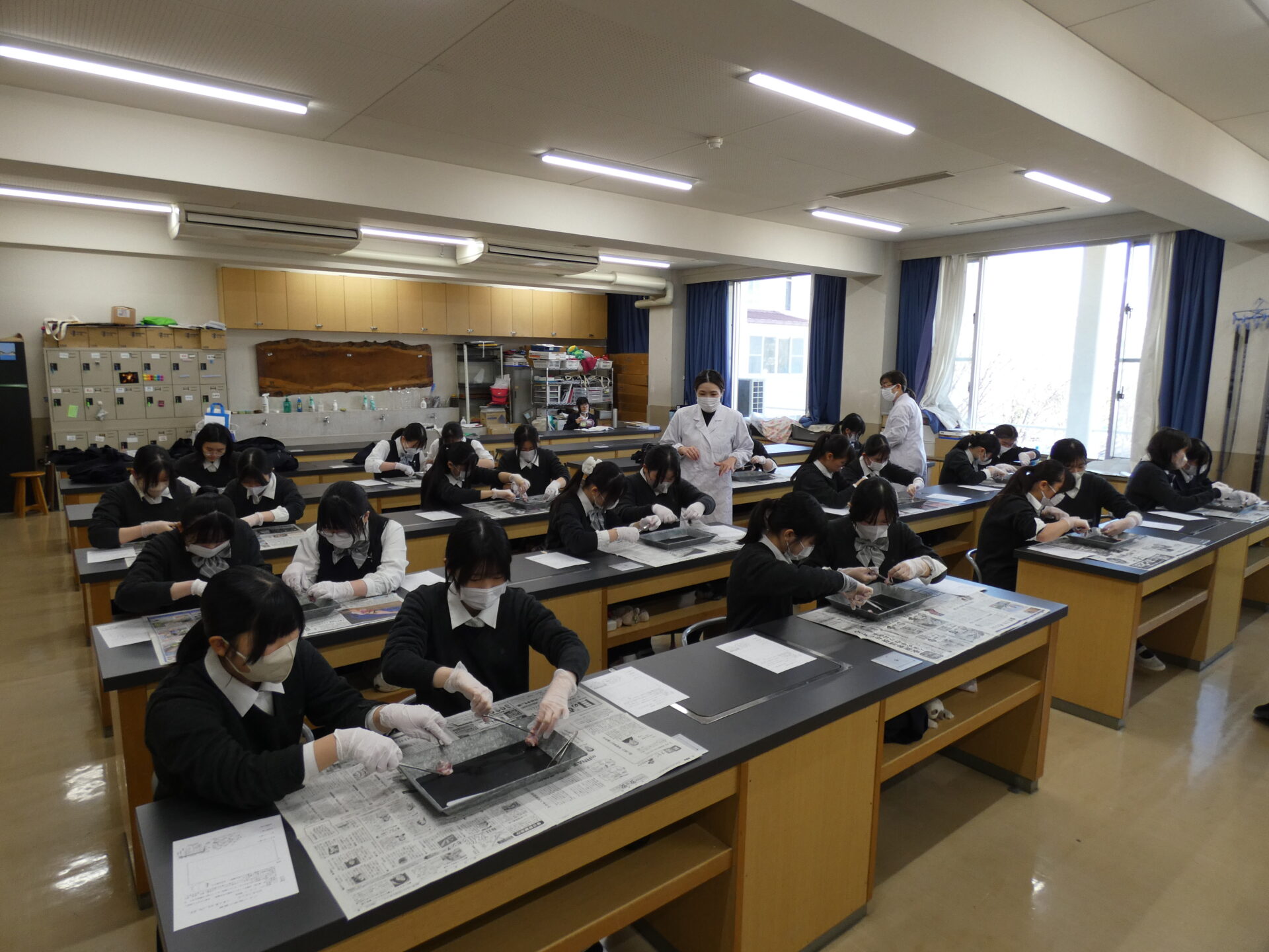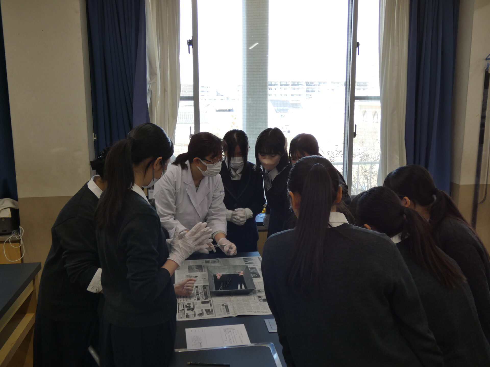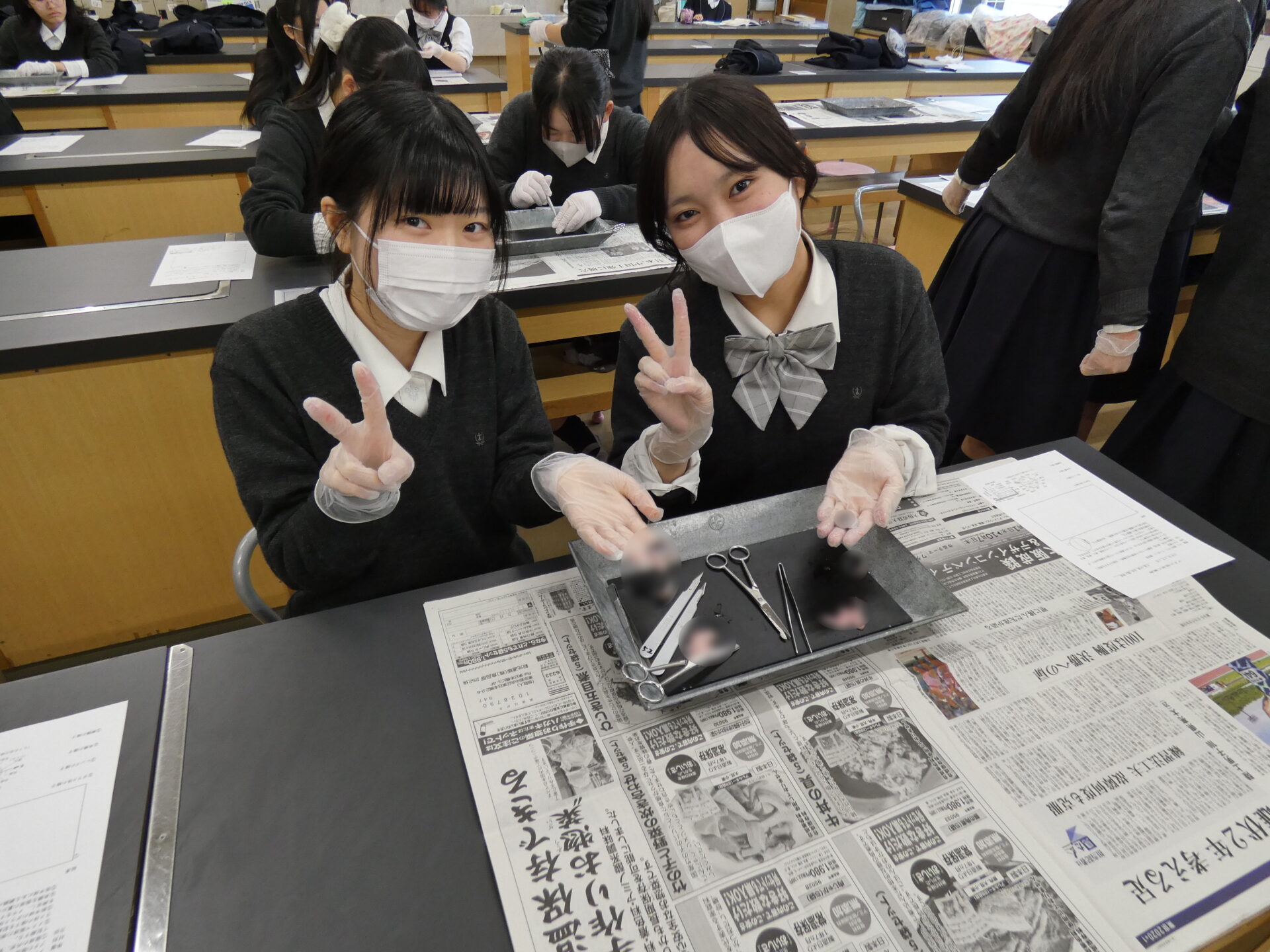 2026.03.12高等学校Ⅲ類Ⅱ類高校_理科実験(豚の目の…) 高校生の理科授業を見学してきました。今日は、豚の目の解剖だそうです。メスと解剖ハサミ、ピンセットを使い、ガラス体やレンズ、角膜や網膜の様子を観察していました。 まずは教員が解剖の実演です。 2人でゆっくりと解剖していきます。 上手くできたようです。(少しボカしておきました。。。)