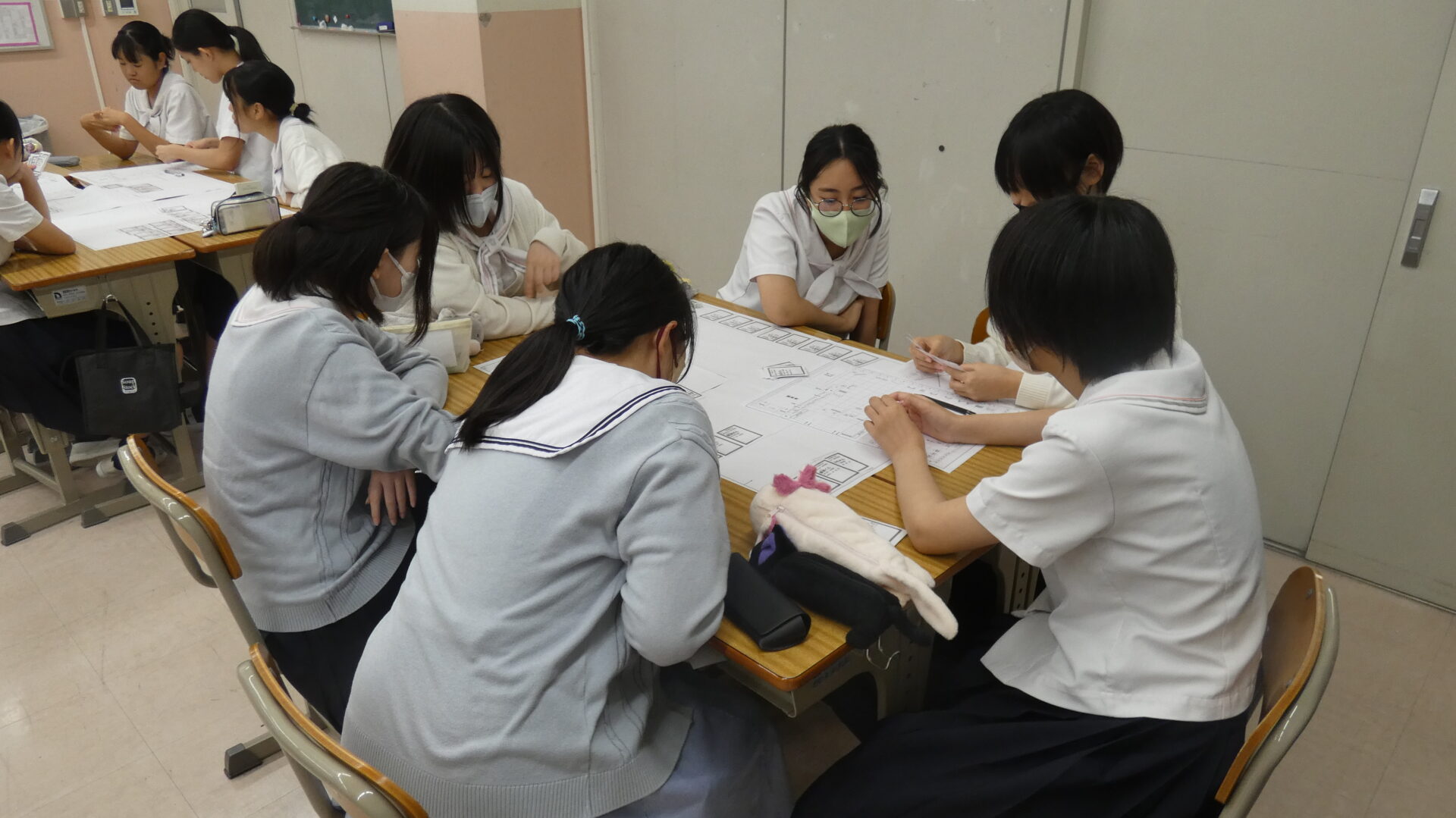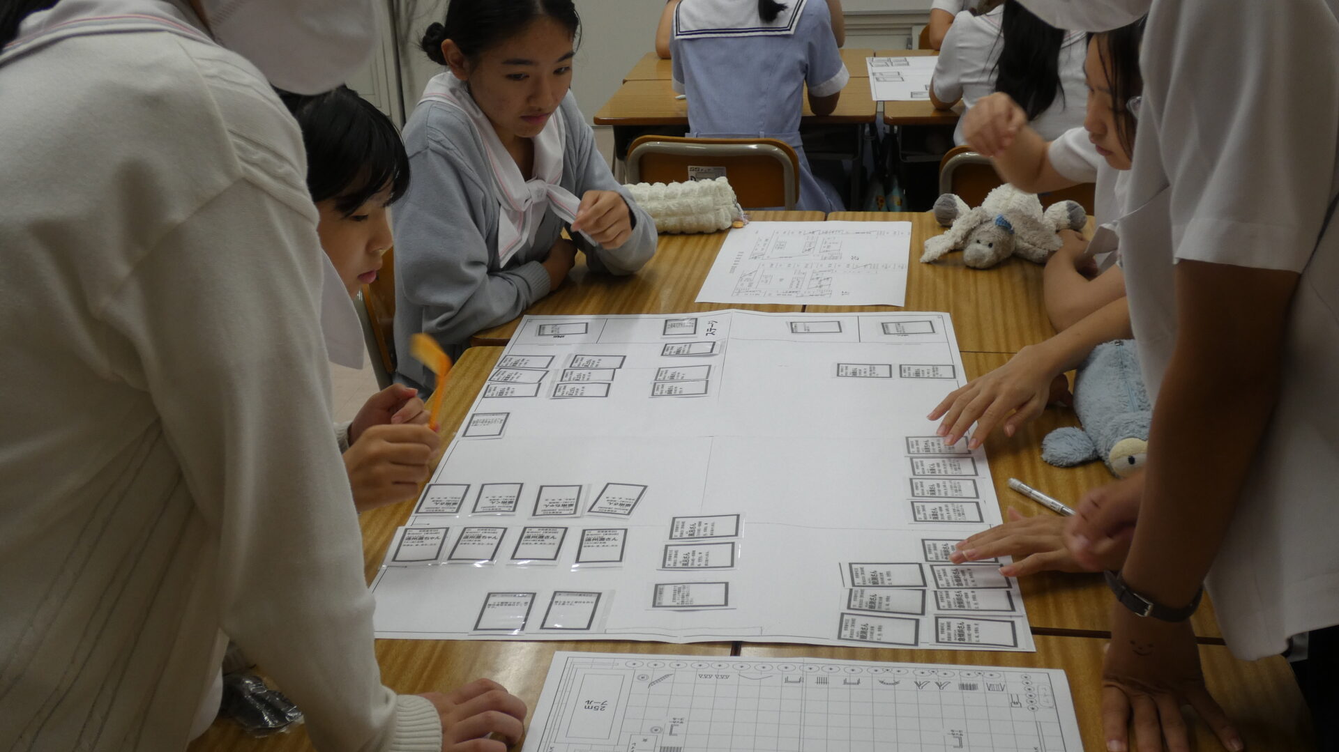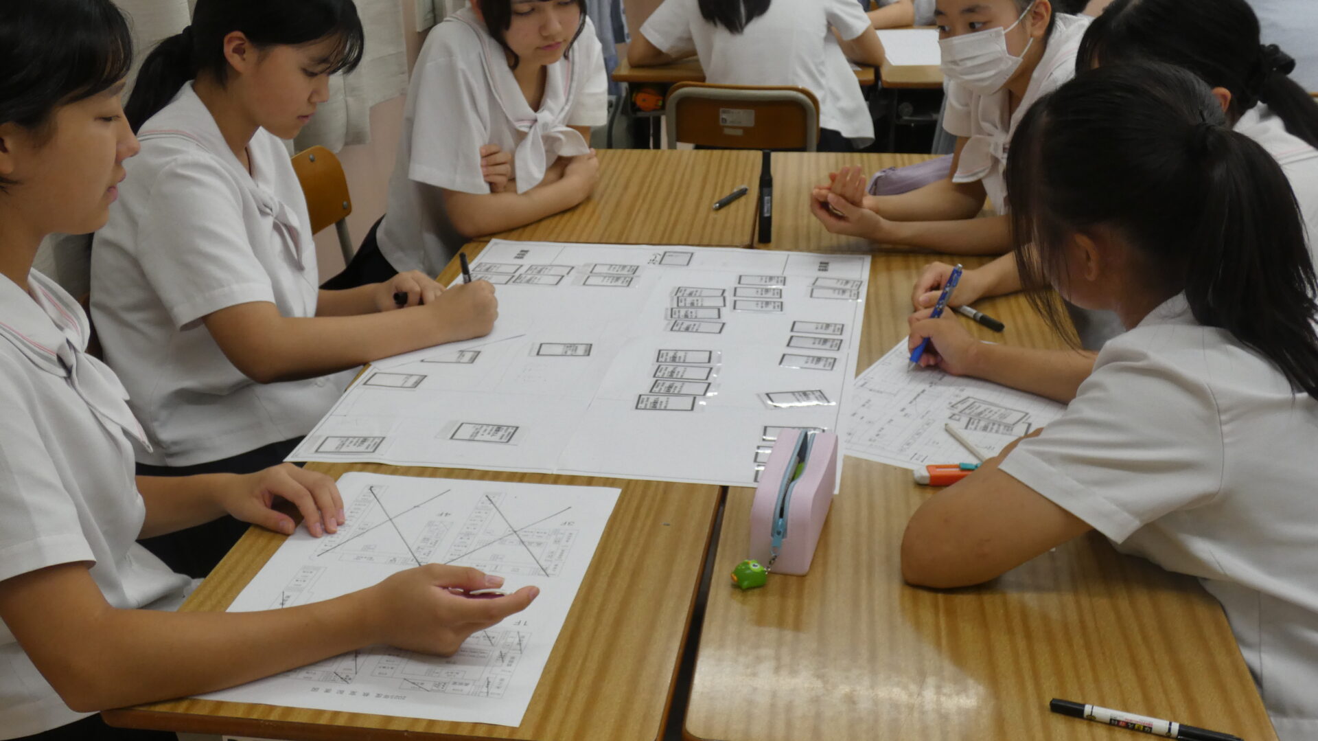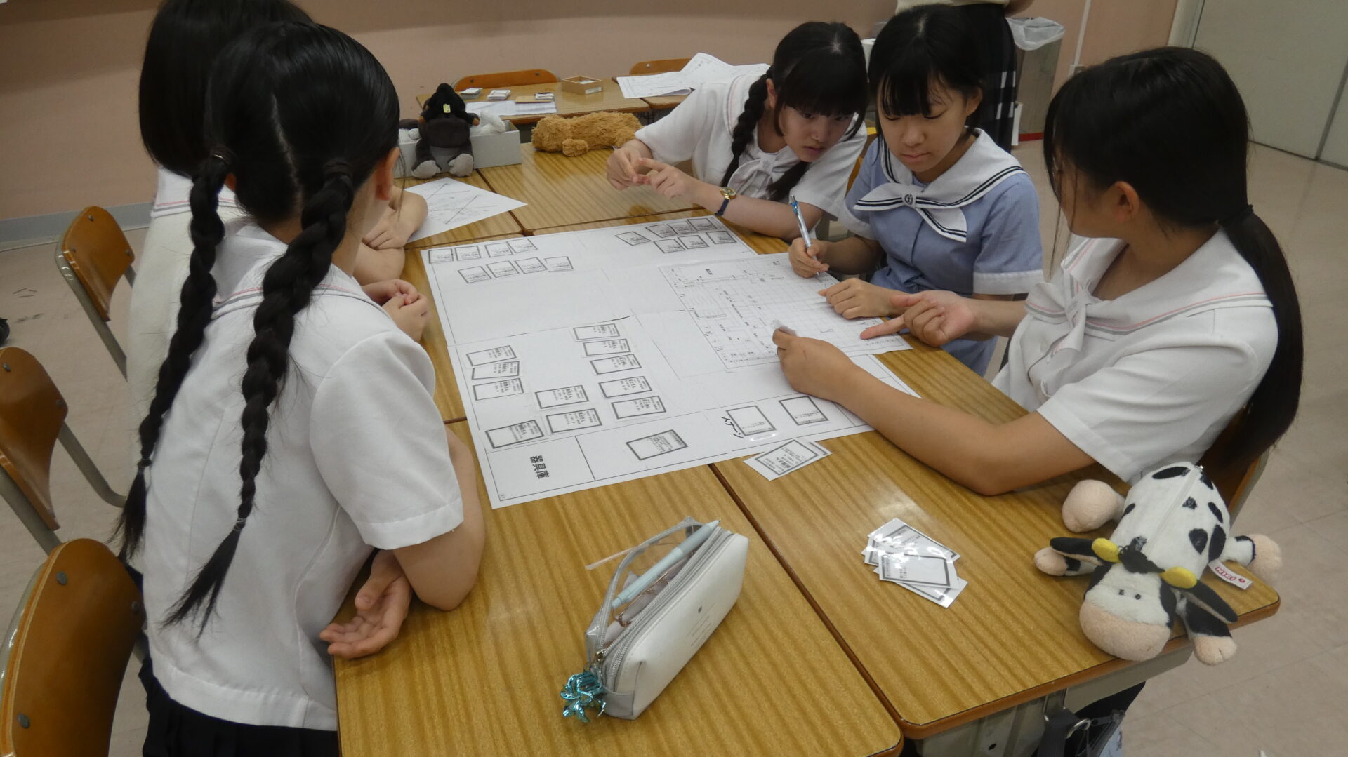 2025.09.21中学校Ⅲ類Ⅱ類中学_避難所HUG① 中学2年生のロングホームルームの授業を見学に行きました。避難所は、様々な年代の方、体調面に配慮が必要な方など沢山の方が利用されます。利用される方にとって少しでも快適に過ごしてもらえるレイアウトとは…、みんな真剣に意見を出し合う姿が印象的でした。