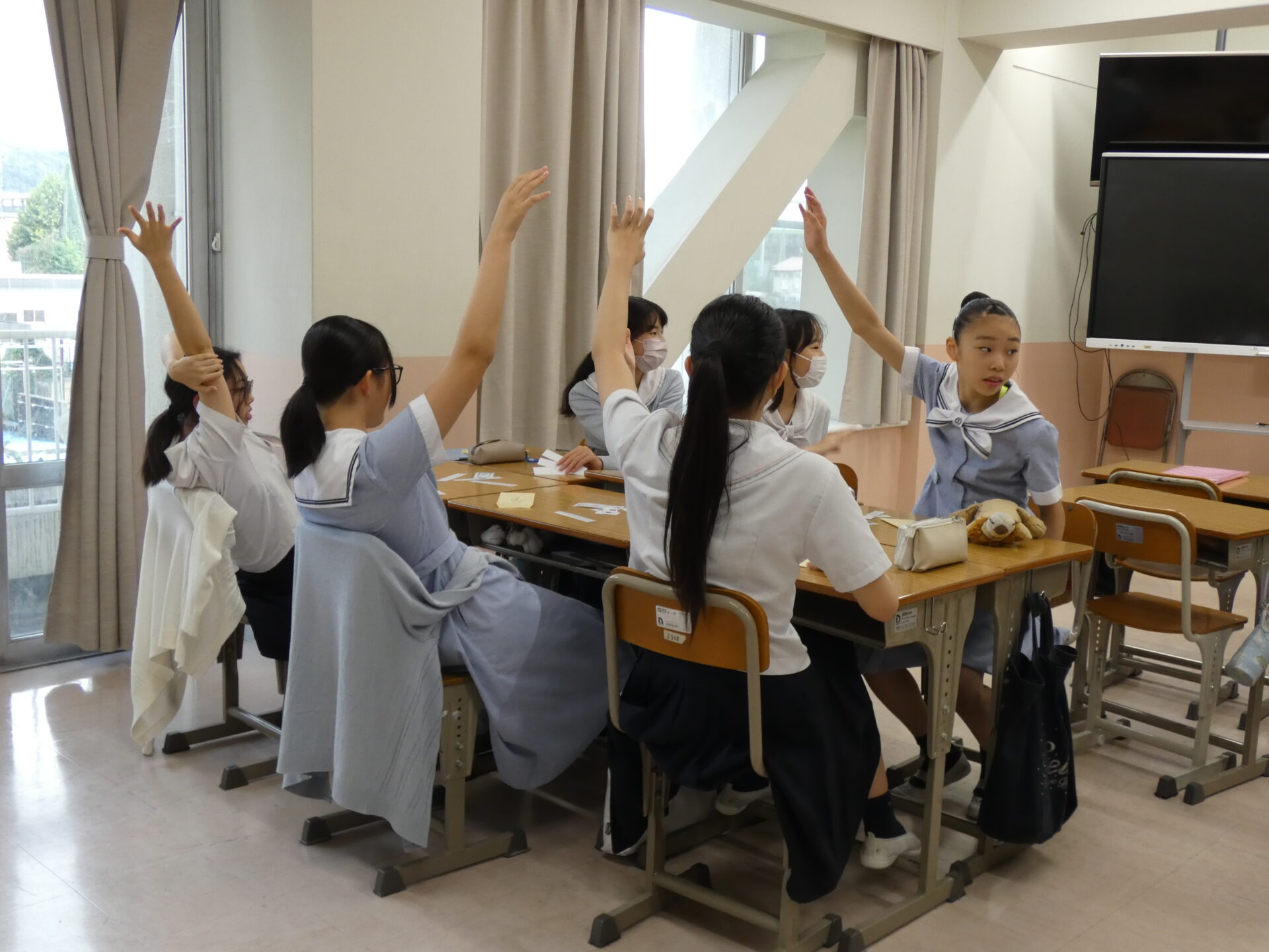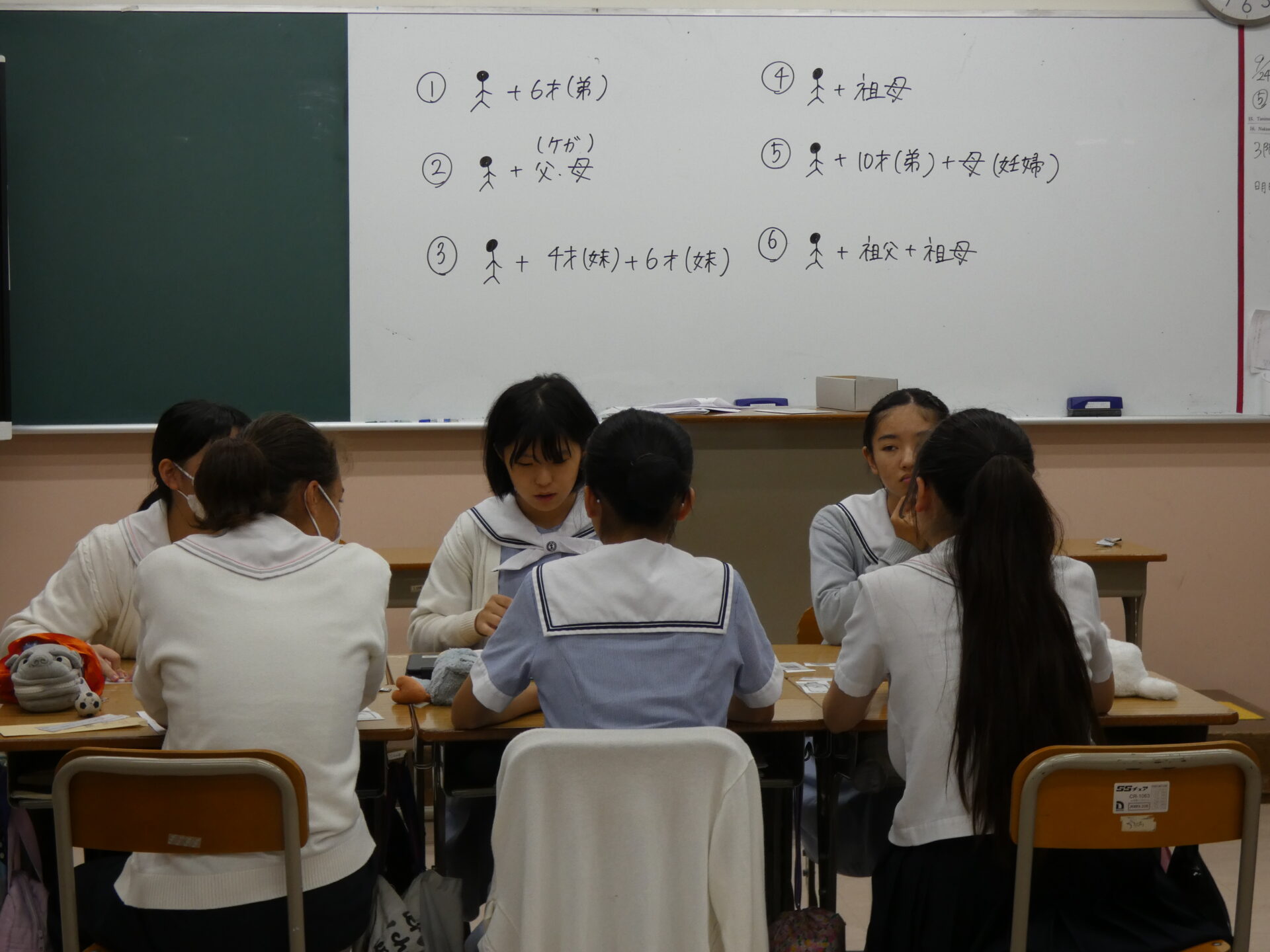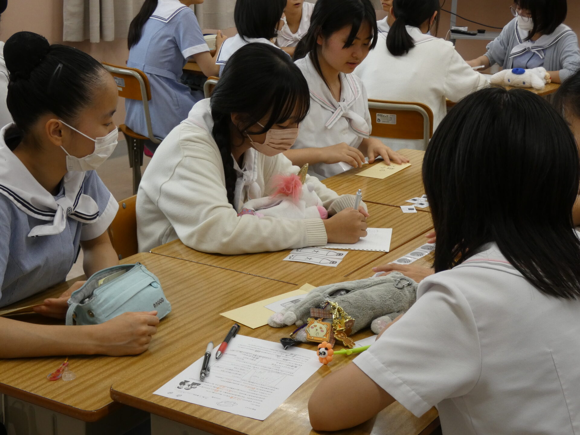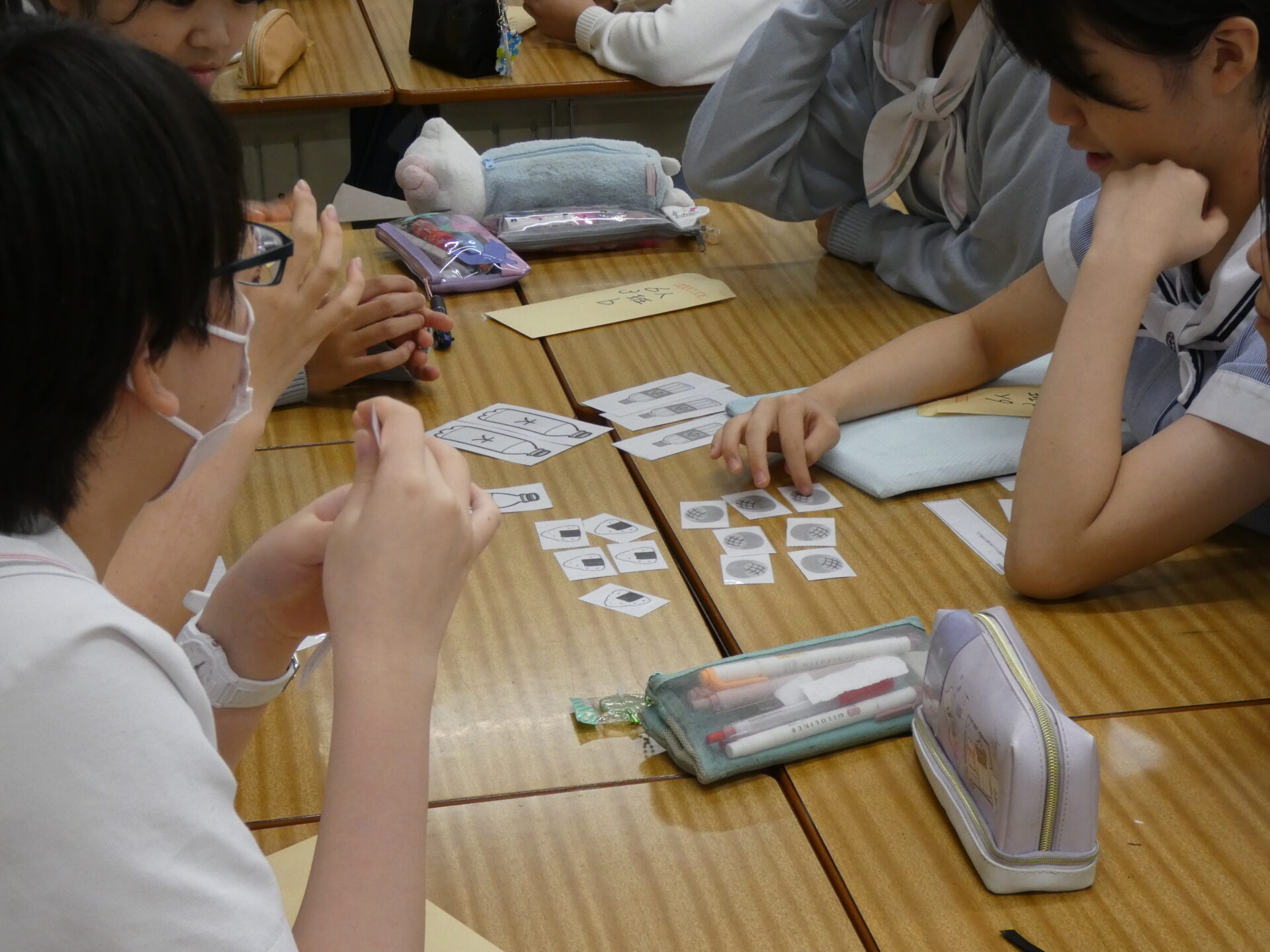 2025.09.26中学校Ⅲ類Ⅱ類中学_避難所HUG② 中学2年生のロングホームルームの授業です。先週に引き続き避難所について議論を交わしました。各家庭の家族構成や、怪我や持病の状況などに配慮し、避難所をみんなが快適に利用できるシステムを考えています。